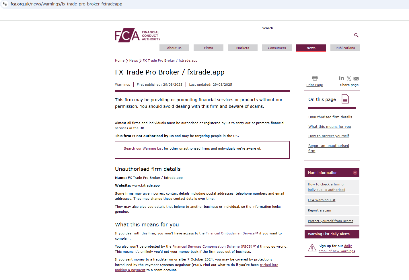 On Aug 29, 2025, the Financial Conduct Authority (FCA) issued a warning against FX Trade Pro Broker, believing this company might be providing financial services or products without proper authorization. https://www.fca.org.uk/news/warnings/fx-trade-pro-broker-fxtradeapp