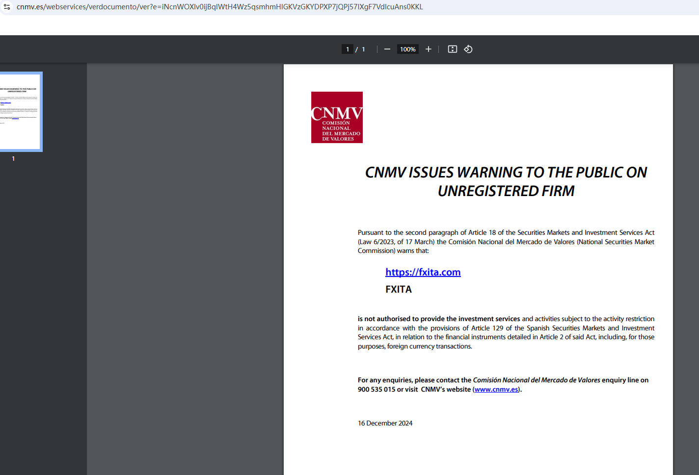 On December 16, 2024, the Comisión Nacional del Mercado de Valores (CNMV) added FXITA to its warning list for providing investment services without authorization. https://www.cnmv.es/webservices/verdocumento/ver?e=iNcnWOXIv0ijBqIWtH4Wz5qsmhmHlGKVzGKYDPXP7jQPj57IXgF7VdIcuAns0KKL