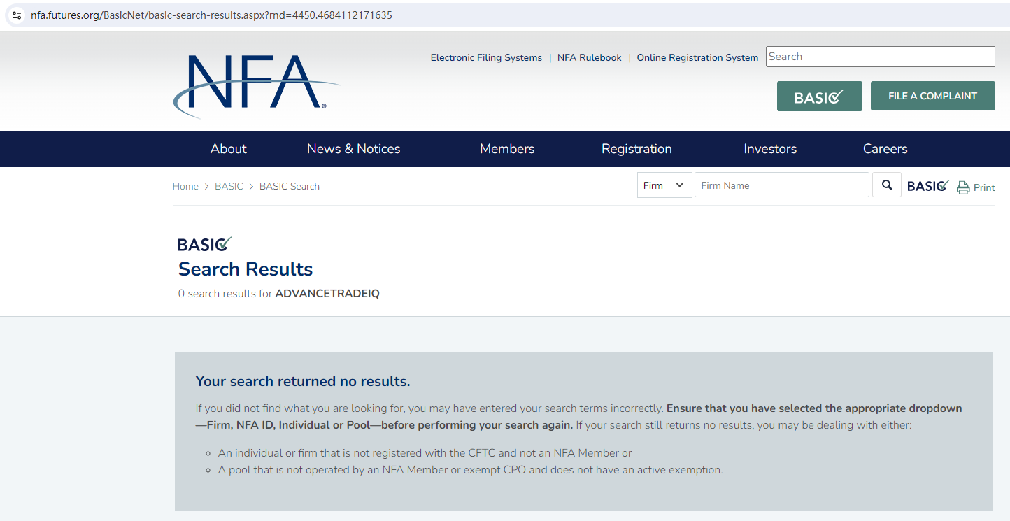 Fxcapitaltrade claims to be regulated in the USA, we searched the National Futures Association (NFA) by the company name Fxcapitaltrade/ADVANCETRADEIQ but found no matching results.