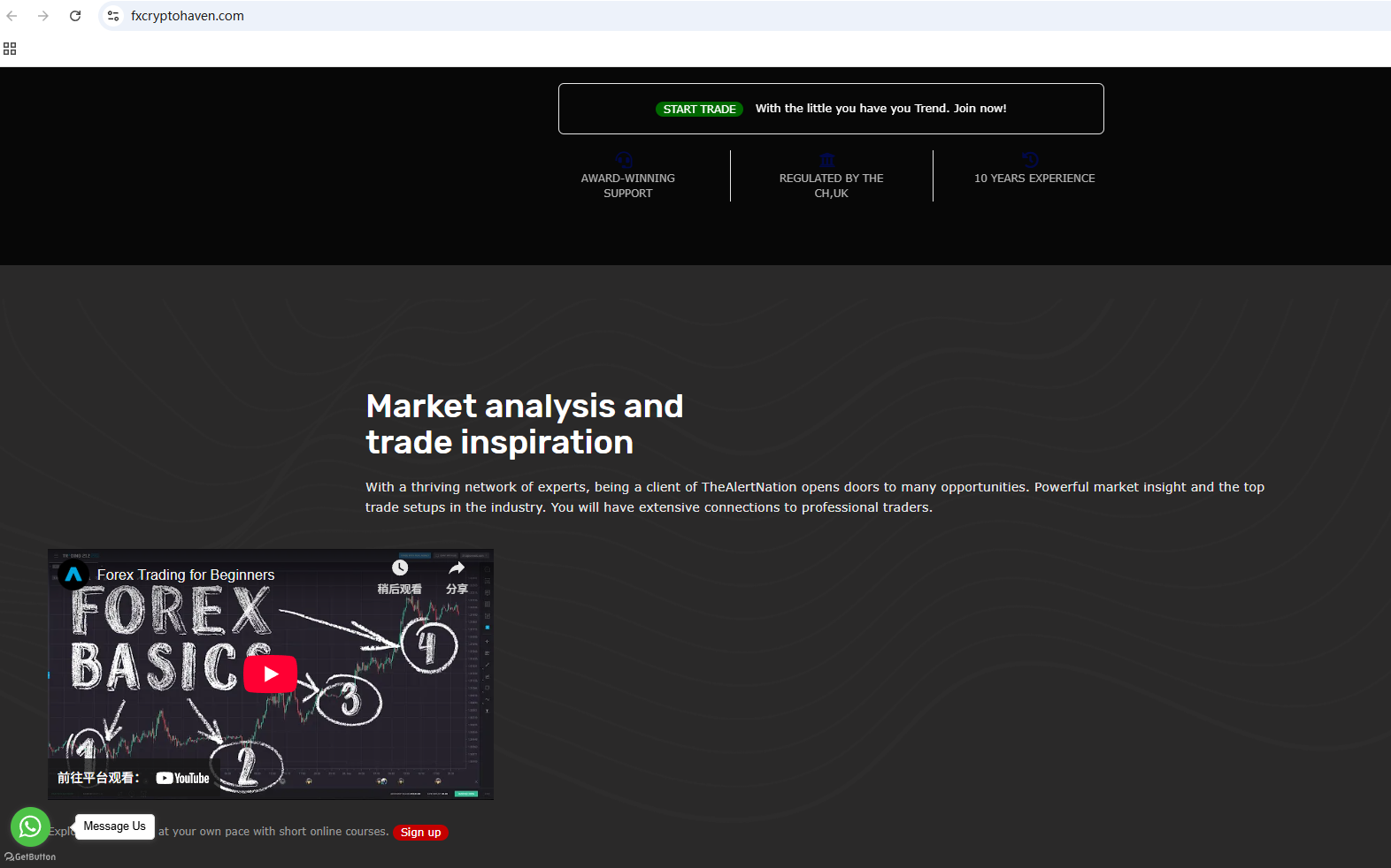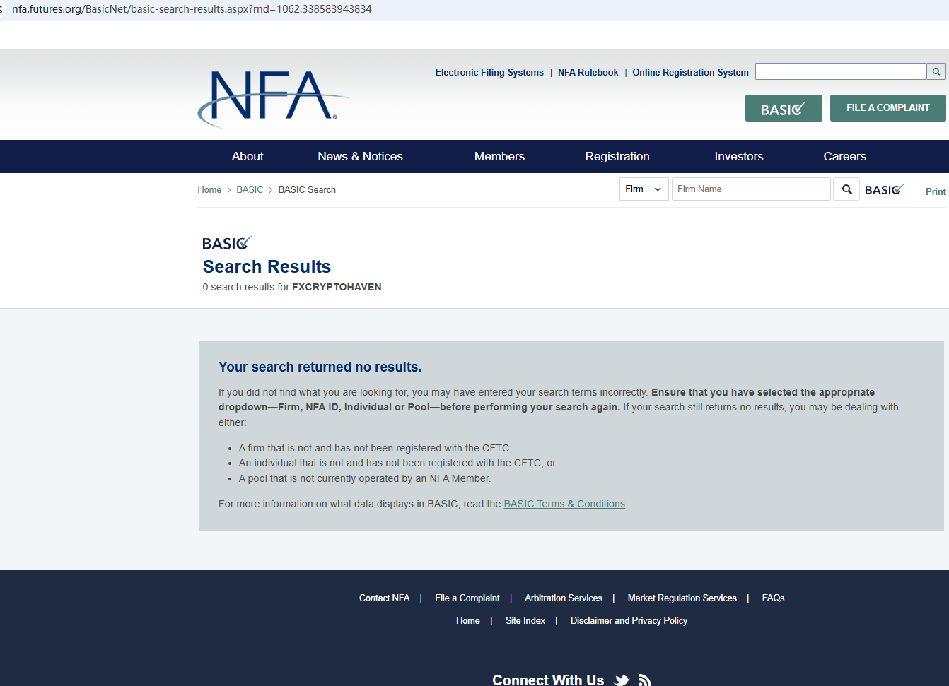 According to its website, it is located in the US. Upon investigation, no matching information was found in the National Futures Association (NFA). In addition, the Financial Conduct Authority (FCA) issued a warning regarding FXCRYPTOHAVEN, suspecting that this company may be offering financial services or products without the necessary authorization.