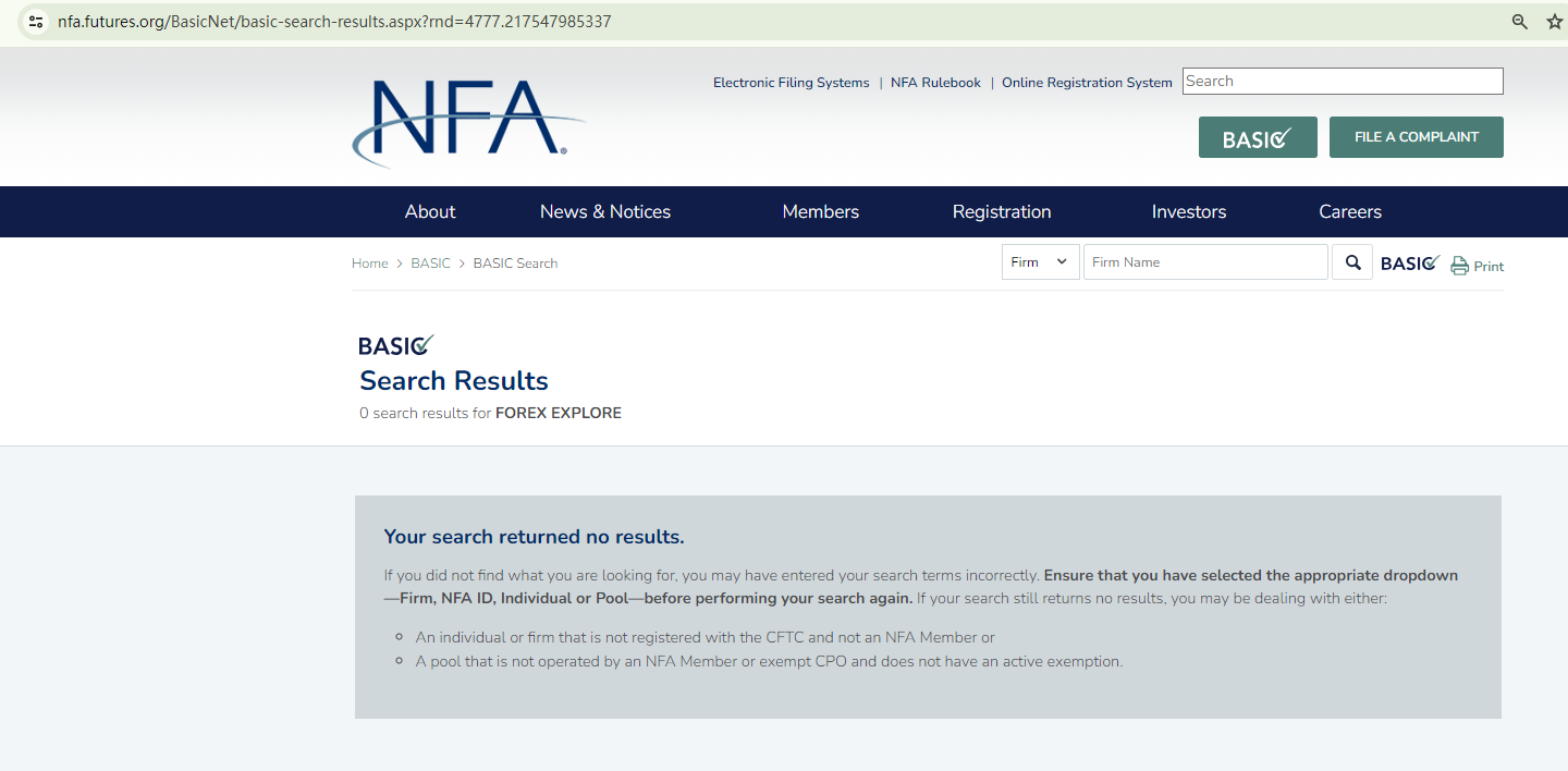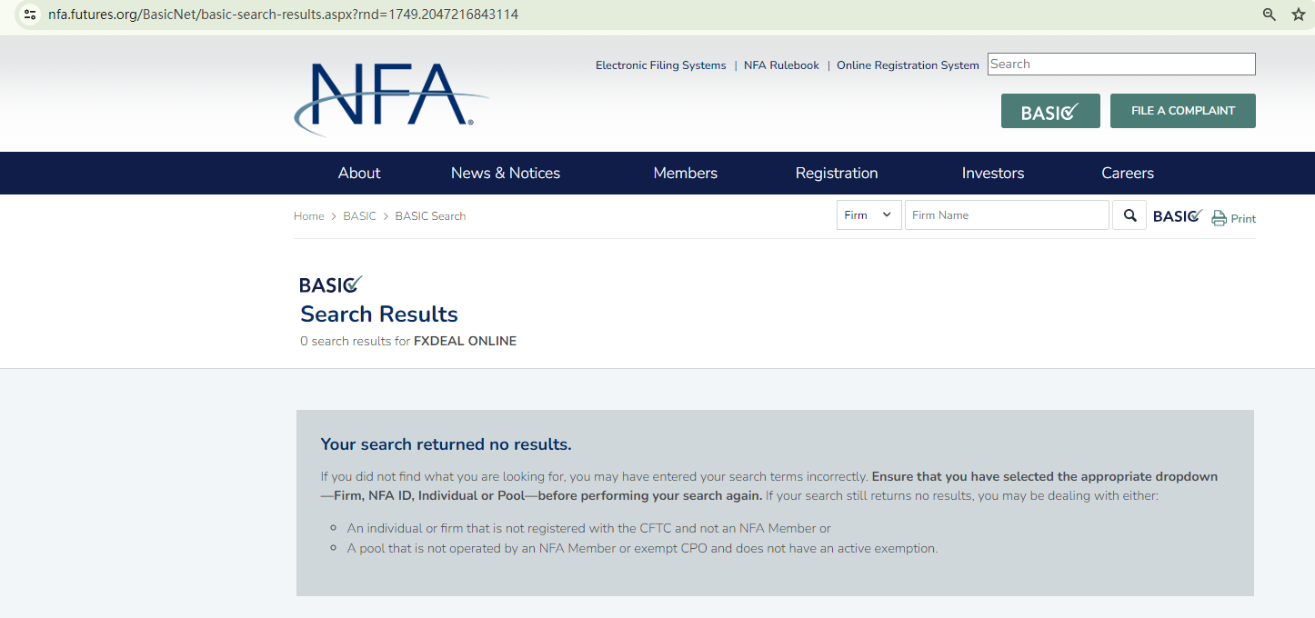 To legally offer investment services in the US, including forex or other asset trading, FXDEAL ONLINE must be registered with the National Futures Association (NFA). However, a search of the NFA database reveals no matches for either "FXDEAL ONLINE" or "Forex Explore".