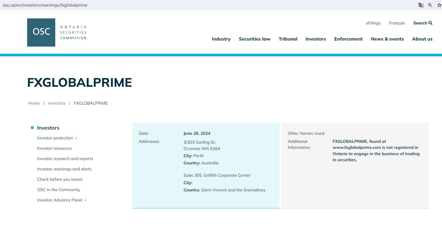 On June 26, 2024, the Ontario Securities Commission (OSC) issued a warning against FxGlobalPrime, stating that this broker is not registered in Ontario to engage in the business of trading in securities.