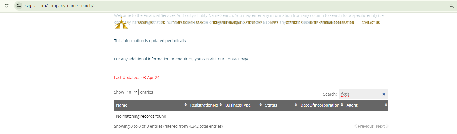 FXGLT previously claimed to be registered with the Financial Services Authority of St. Vincent and the Grenadines (SVG FSA). However, there are no longer any matching records on the SVG FSA register, suggesting that its registration may have been revoked. Even if the registration were still in effect, FXGLT's services would be unlicensed, as the SVG FSA has explicitly stated that forex trading brokerage activities are not licensed in St. Vincent and the Grenadines.