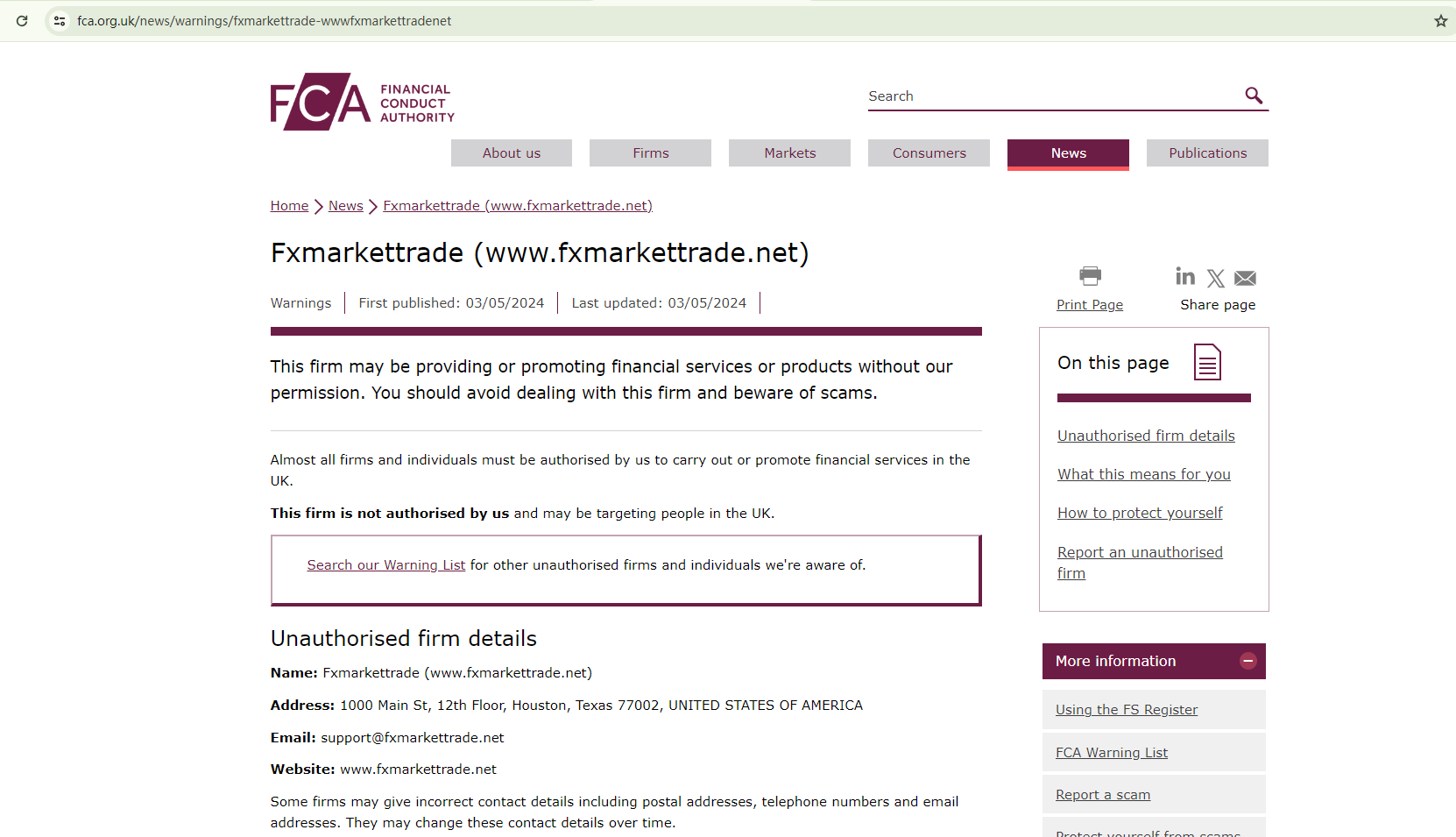 On May 3rd, 2024, the Financial Conduct Authority (FCA) issued a warning against Fxmarkettrade, believing this company might be providing financial services or products without proper authorization in the UK. https://www.fca.org.uk/news/warnings/fxmarkettrade-wwwfxmarkettradenet