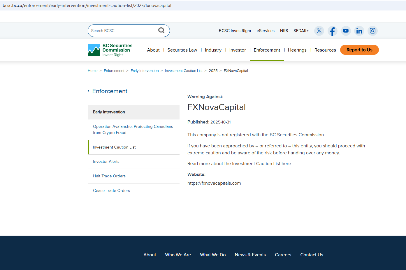 On Oct 31, 2025, the British Columbia Securities Commission (BCSC) issued a warning against FXNovaCapital, stating that this broker is not registered to trade in, or advise on, securities or derivatives in BC. https://www.bcsc.bc.ca/enforcement/early-intervention/investment-caution-list/2025/fxnovacapital