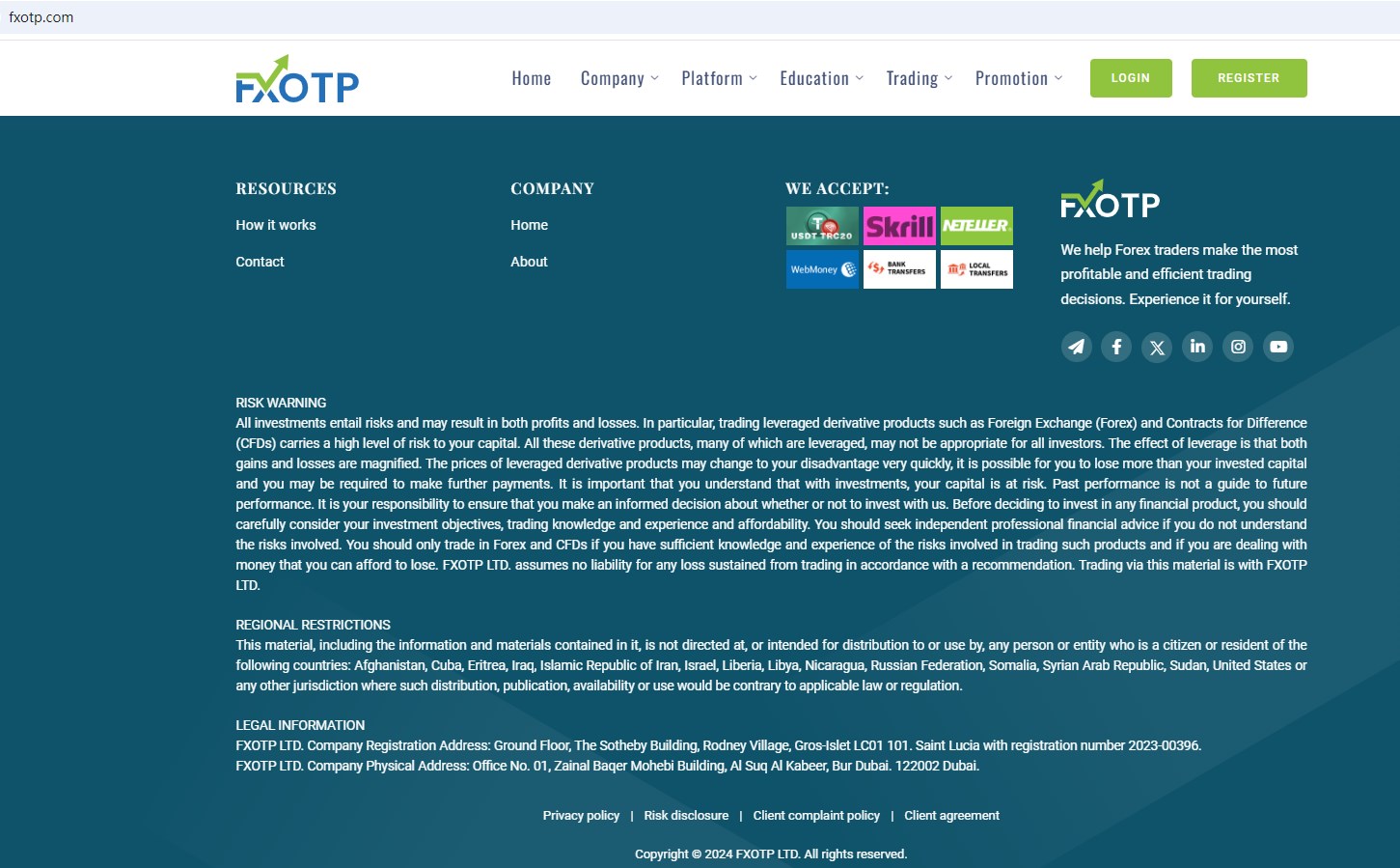 FXOTP claims to be a forex company registered in Saint Lucia with registration number 2023-00396, operated in Dubai, U.A.E., which offers forex trading services to clients worldwide.