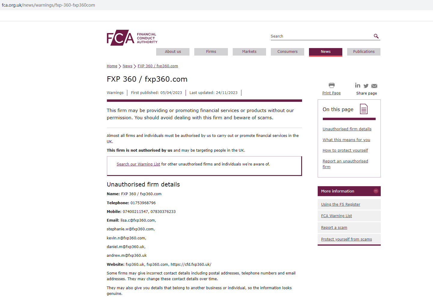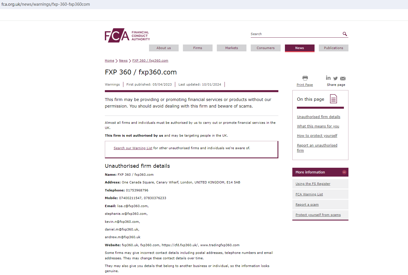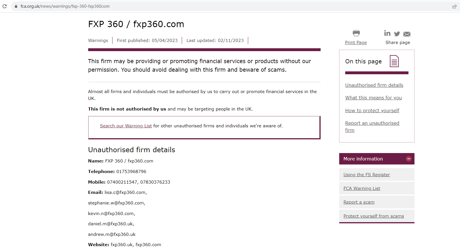 Since FXP360 is still in business to steal money from unsuspecting investors, FCA updates its warning against the platform with more details about the unauthorized firm and cautions the public to stay away from it once again. You may visit: https://www.fca.org.uk/news/warnings/fxp-360-fxp360com