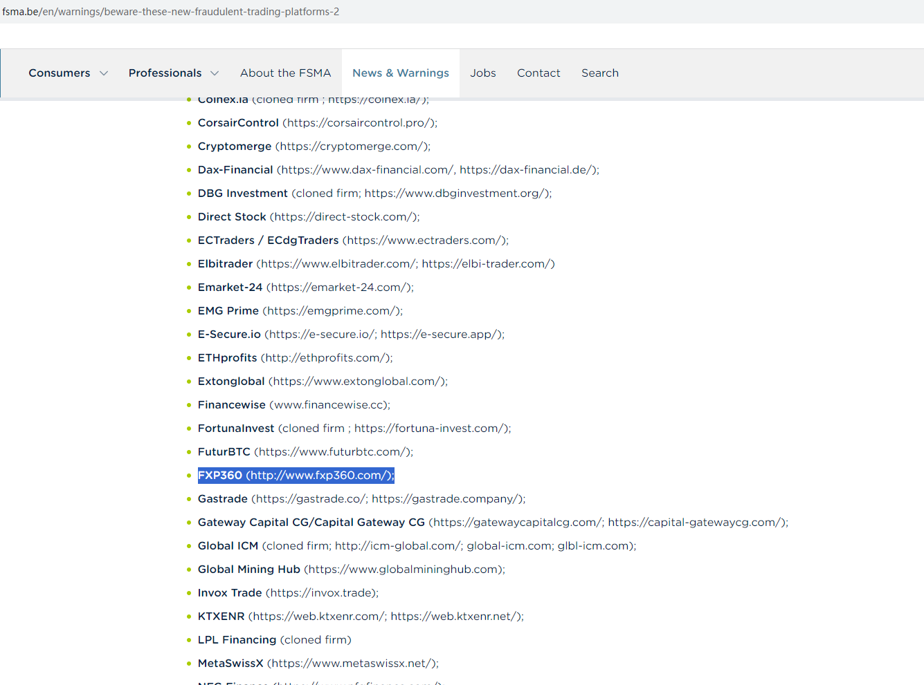 On November 30, 2023, the Belgian Financial Services and Markets Authority (FSMA) added FXP360 to its warning list as a fraudulent trading platform operating in the Belgian market. https://www.fsma.be/en/warnings/beware-these-new-fraudulent-trading-platforms-2