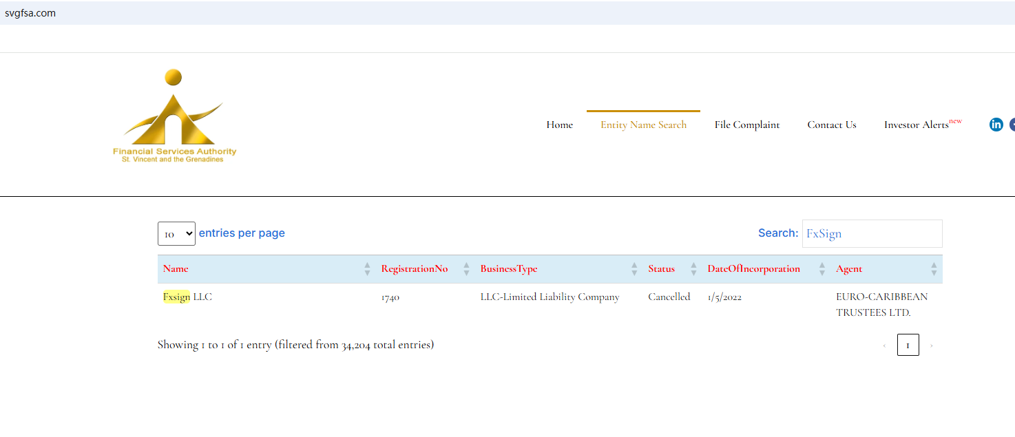 The website of FxSign is currently unavailable. The claimed registration with the Financial Services Authority of St. Vincent and The Grenadines (SVG FSA) has been canceled as well. All the signs indicate substantial risks of FxSign. Investors should be informed about the development and stay clear of it.