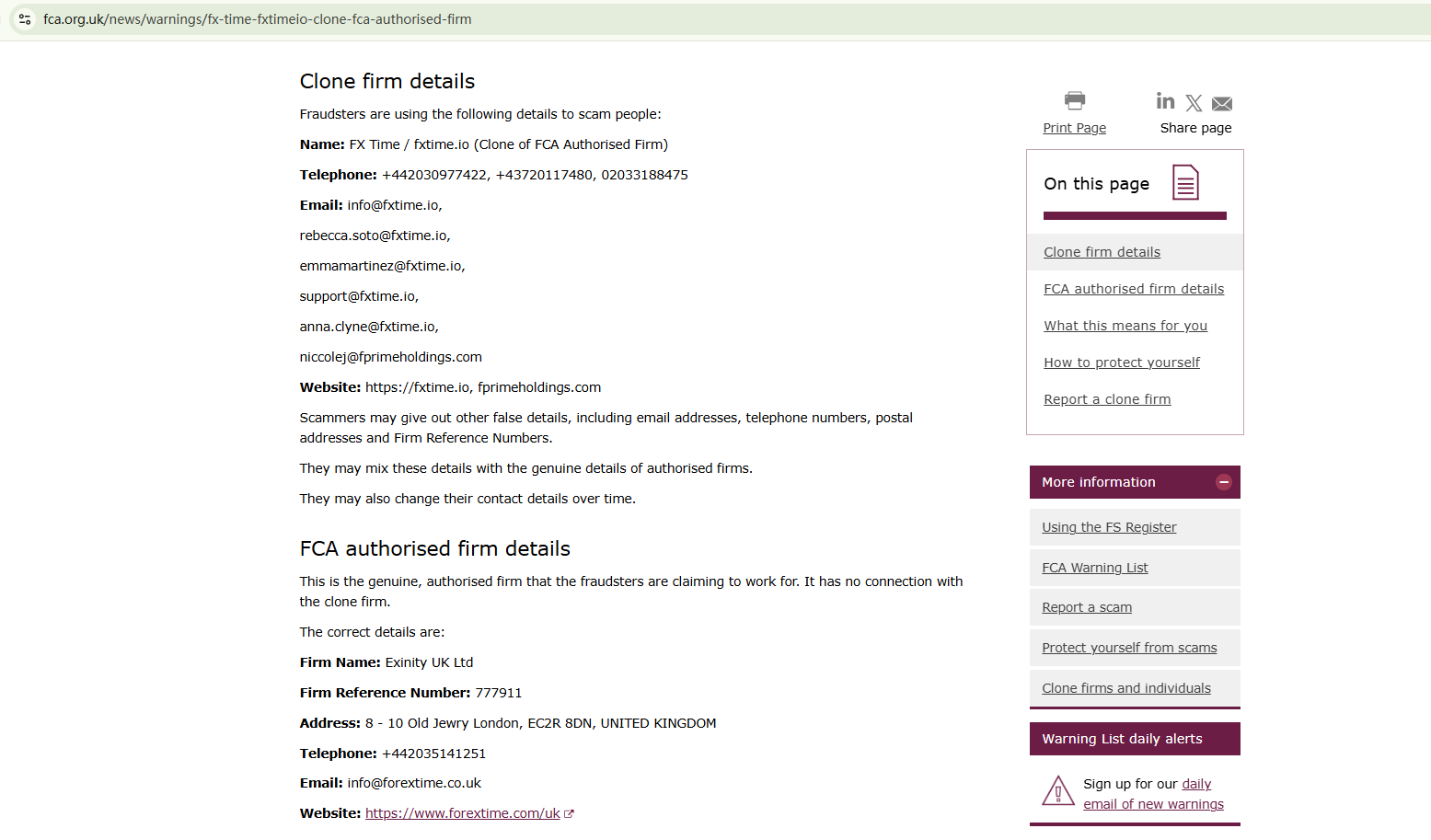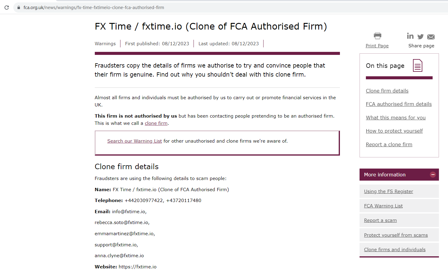 On 8 December 2023, the United Kingdom Financial Conduct Authority (UK FCA) issued a warning that FXTime was a clone of FCA Authorised firm, Exinity UK Ltd. You may visit: https://www.fca.org.uk/news/warnings/fx-time-fxtimeio-clone-fca-authorised-firm