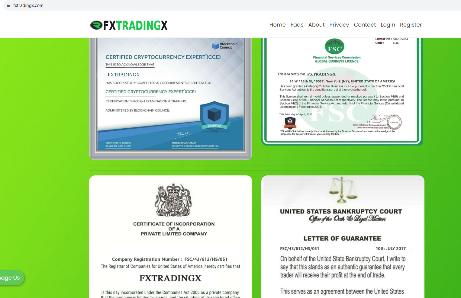 Fxtradingx claims to be a multiple regulated broker, but the Blockchain Council and the United States Bankruptcy Court are not valid register/ regulatory institutions, we seached the Financial Services Commission, Mauritius (FSC) and the UK Companies House found no matching results. And this broker locates in the UK, we also searched the United Kingdom Financial Conduct Authority (UK FCA) and found it was unauthorised. It is a red flag.