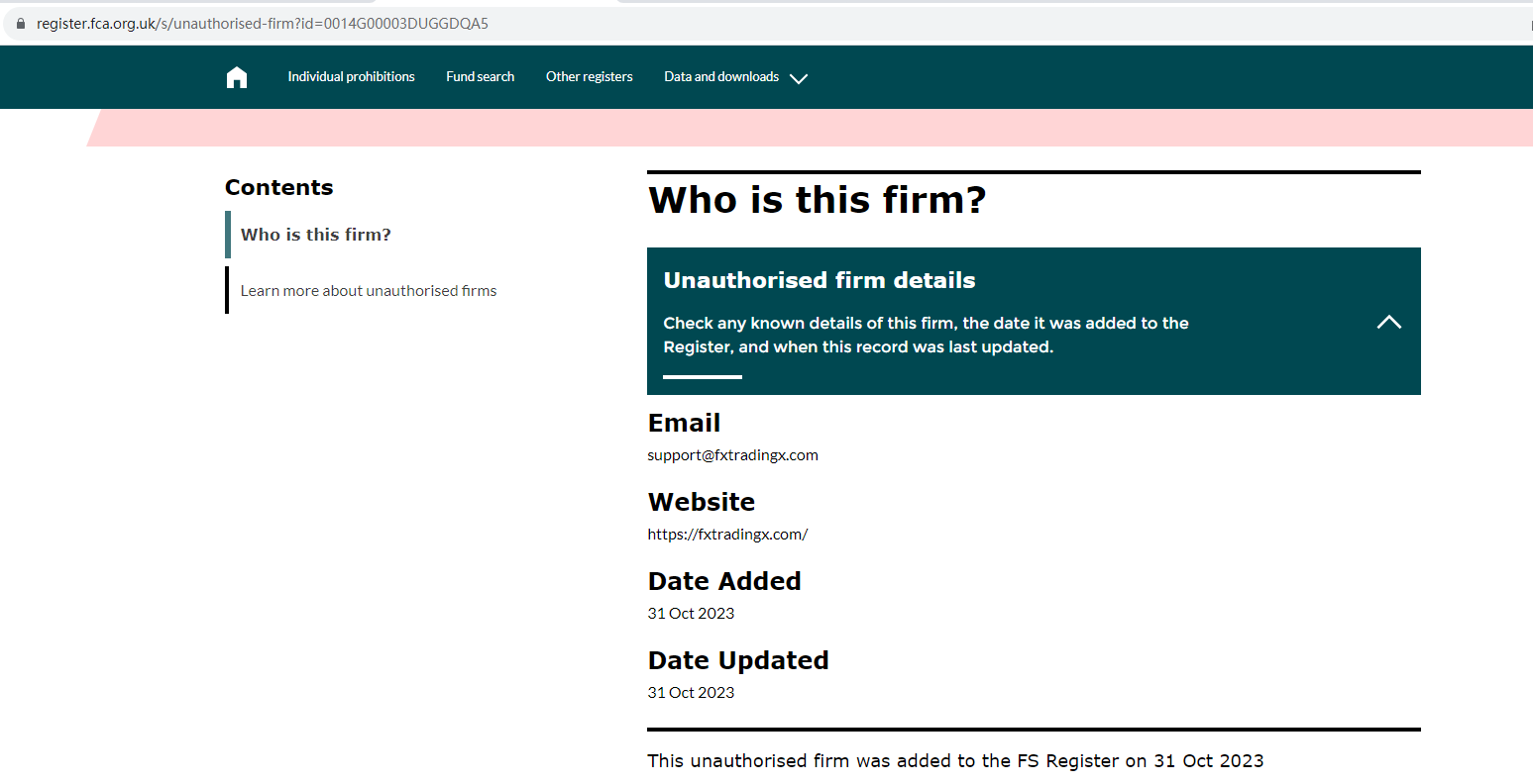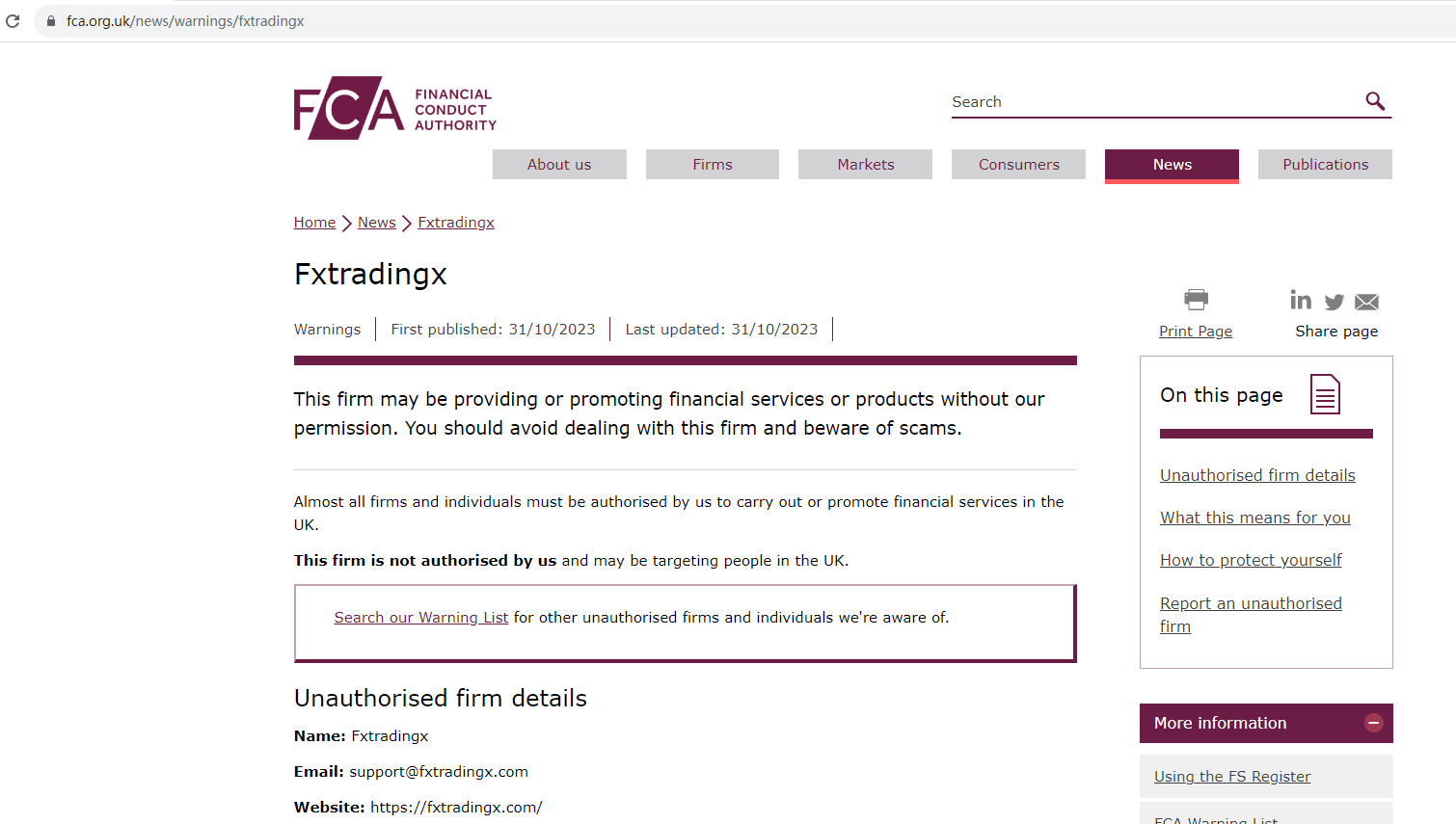 On 31 October 2023, the United Kingdom Financial Conduct Authority (UK FCA) issued a warning that Fxtradingx was providing financial services or products in the UK without authorisation. You may visit: https://www.fca.org.uk/news/warnings/fxtradingx