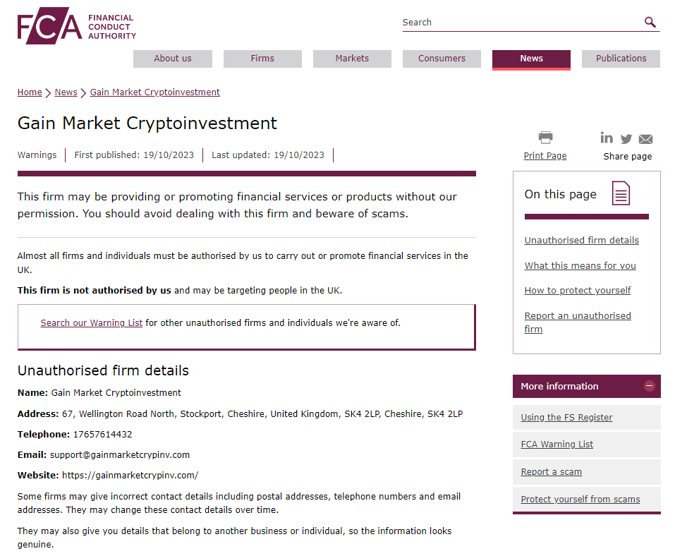 On 19 October 2023, the United Kingdom Financial Conduct Authority (UK FCA) issued a warning that Gain Market Cryptoinvestment was providing financial services or products in the UK without authorisation. You may visit: https://www.fca.org.uk/news/warnings/gain-market-cryptoinvestment