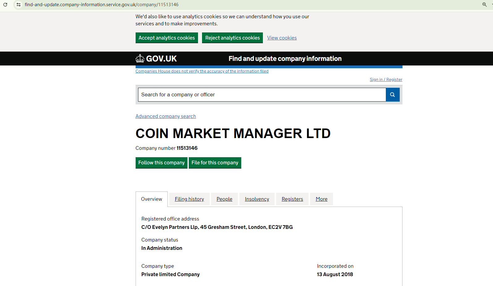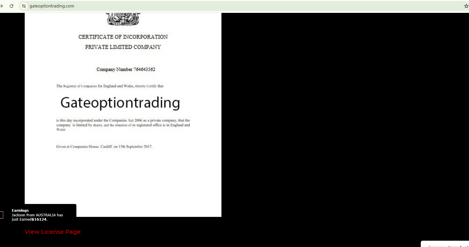 GATEOPTIONTRADING claims to be regulated in the UK and showcases a certificate from Companies House (CH). It also provides a link labeled 'View License Page' beneath the purported certificate, which is designed to direct investors to the CH page. However, this link takes investors to the records page of COIN MARKET MANAGER LTD, not GATEOPTIONTRADING, with no evidence of any link between the two entities. Furthermore, the CH registration number alleged by GATEOPTIONTRADING does not match any records in the register.