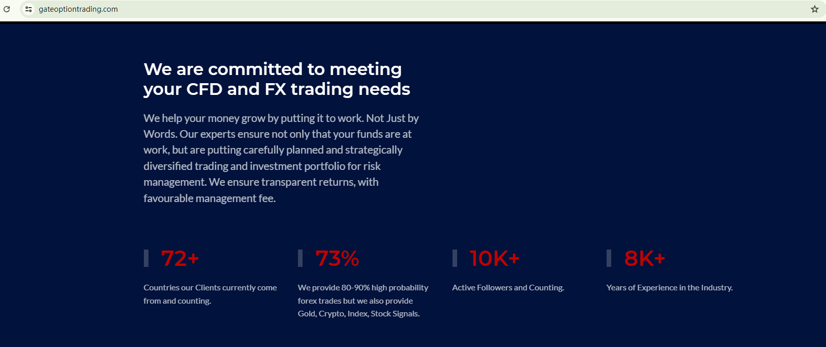 In essence, GATEOPTIONTRADING is not regulated by any governing body. Entrusting it with investors' funds is highly risky, as there are no legal protections in place to safeguard the funds.