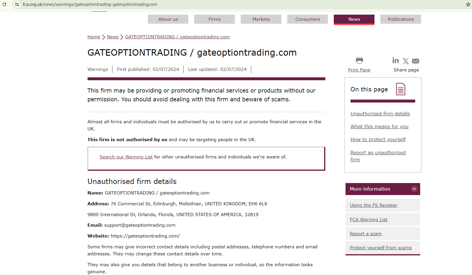 Additionally, the Financial Conduct Authority (FCA), the UK's financial watchdog, has issued a warning against GATEOPTIONTRADING, explicitly stating that it is an unauthorized firm.