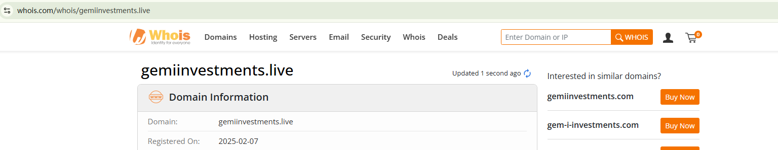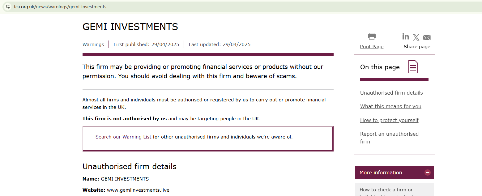 On April 29, 2025, the Financial Conduct Authority (FCA) issued a warning against GEMI INVESTMENTS, believing this company might be providing financial services or products without proper authorization in the UK. https://www.fca.org.uk/news/warnings/gemi-investments