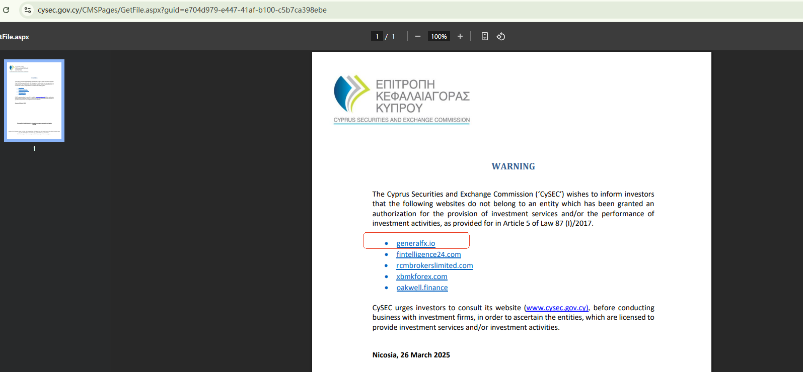 On March 26, 2025, the Cyprus Securities and Exchange Commission (CySEC) blacklisted General FX for offering investment services without the required authorization. https://www.cysec.gov.cy/CMSPages/GetFile.aspx?guid=e704d979-e447-41af-b100-c5b7ca398ebe