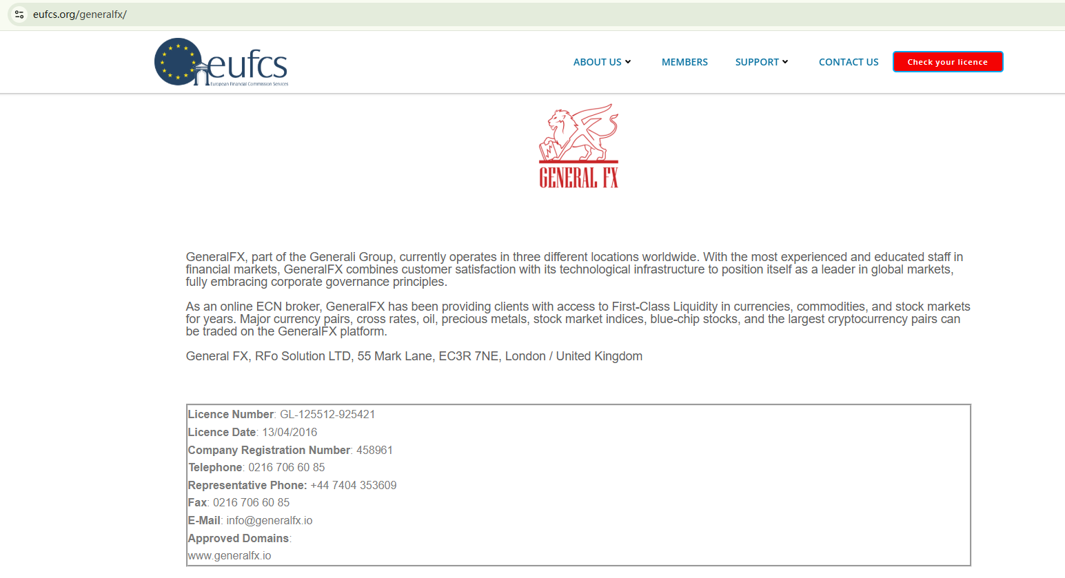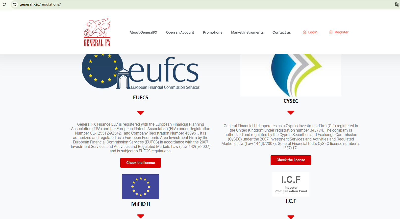 General FX claims to be regulated by the EUFCS and the Cyprus Securities and Exchange Commission (CySEC). However, EUFCS is a fake authority and the CySEC has added General FX to its warning list, refuting such regulatory claims.
