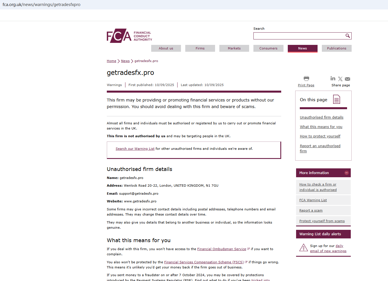 On Sept 10, 2025, the Financial Conduct Authority (FCA) issued a warning against Getradesfx, believing this company might be providing financial services or products without proper authorization. https://www.fca.org.uk/news/warnings/getradesfxpro