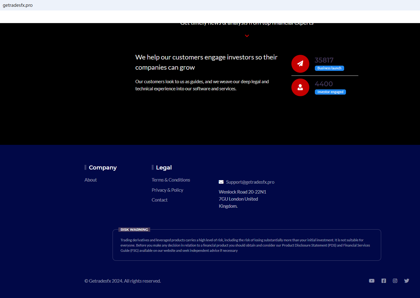 This website utilizes a common template used by scam websites and has been flagged multiple times by Brokersview. Such websites often share similar web designs and logos and are generally considered highly unreliable. Investors are advised to stay away. It claims to be located in the UK, yet ironically, the Financial Conduct Authority (FCA) issued a warning against Getradesfx, believing this company might be providing financial services or products without proper authorization.