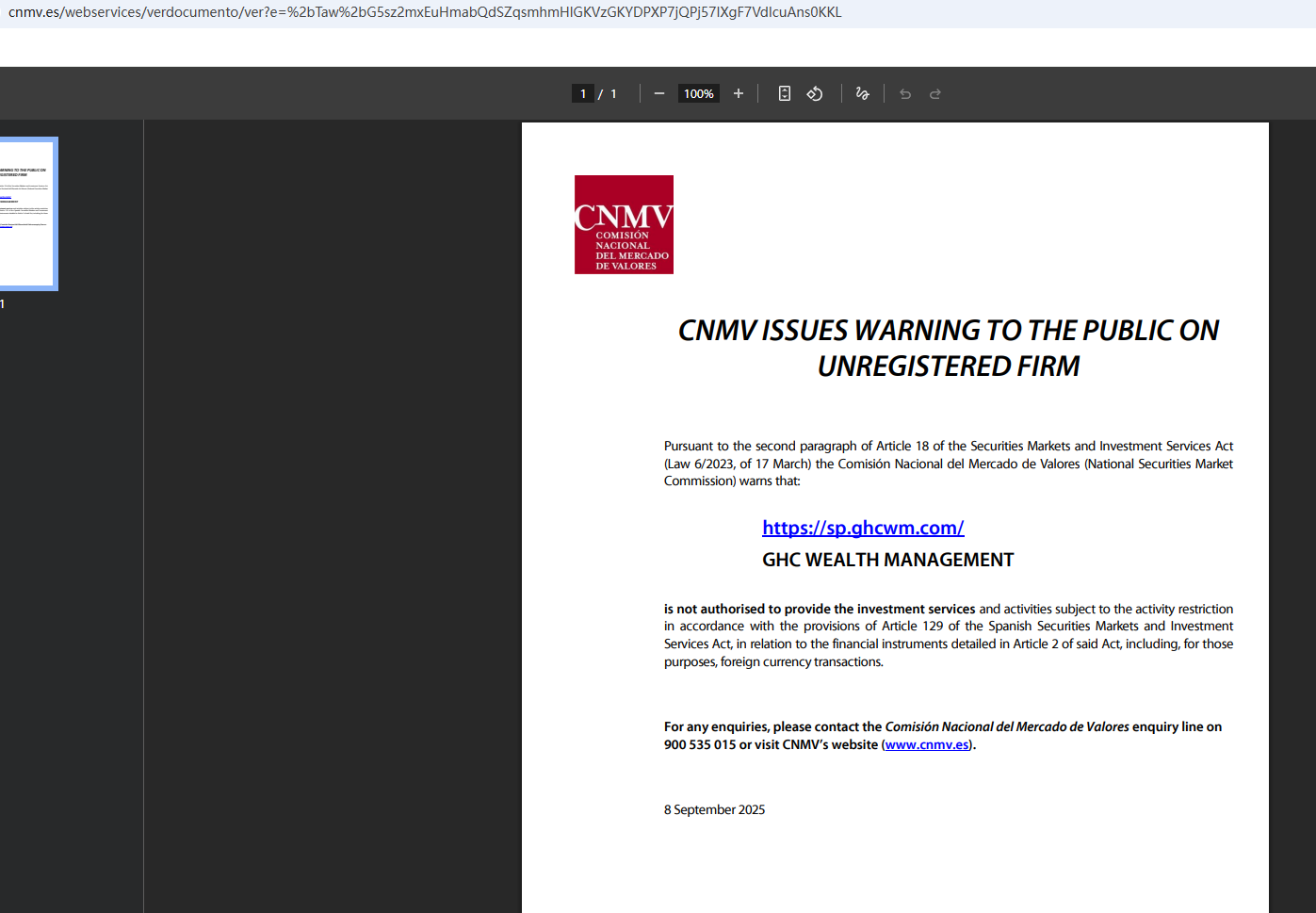 On Sept 8, 2025, the National Securities Market Commission (CNMV) issued a warning against GHC Wealth Management, believing this company might be providing financial services or products without proper authorization. https://www.cnmv.es/webservices/verdocumento/ver?e=%2bTaw%2bG5sz2mxEuHmabQdSZqsmhmHlGKVzGKYDPXP7jQPj57IXgF7VdIcuAns0KKL