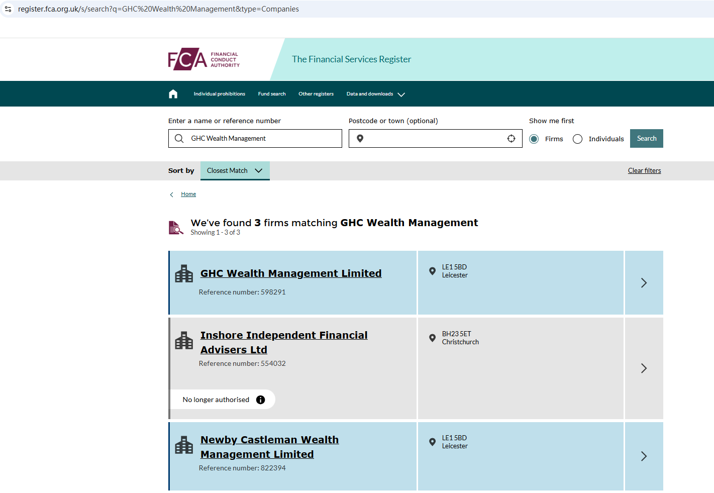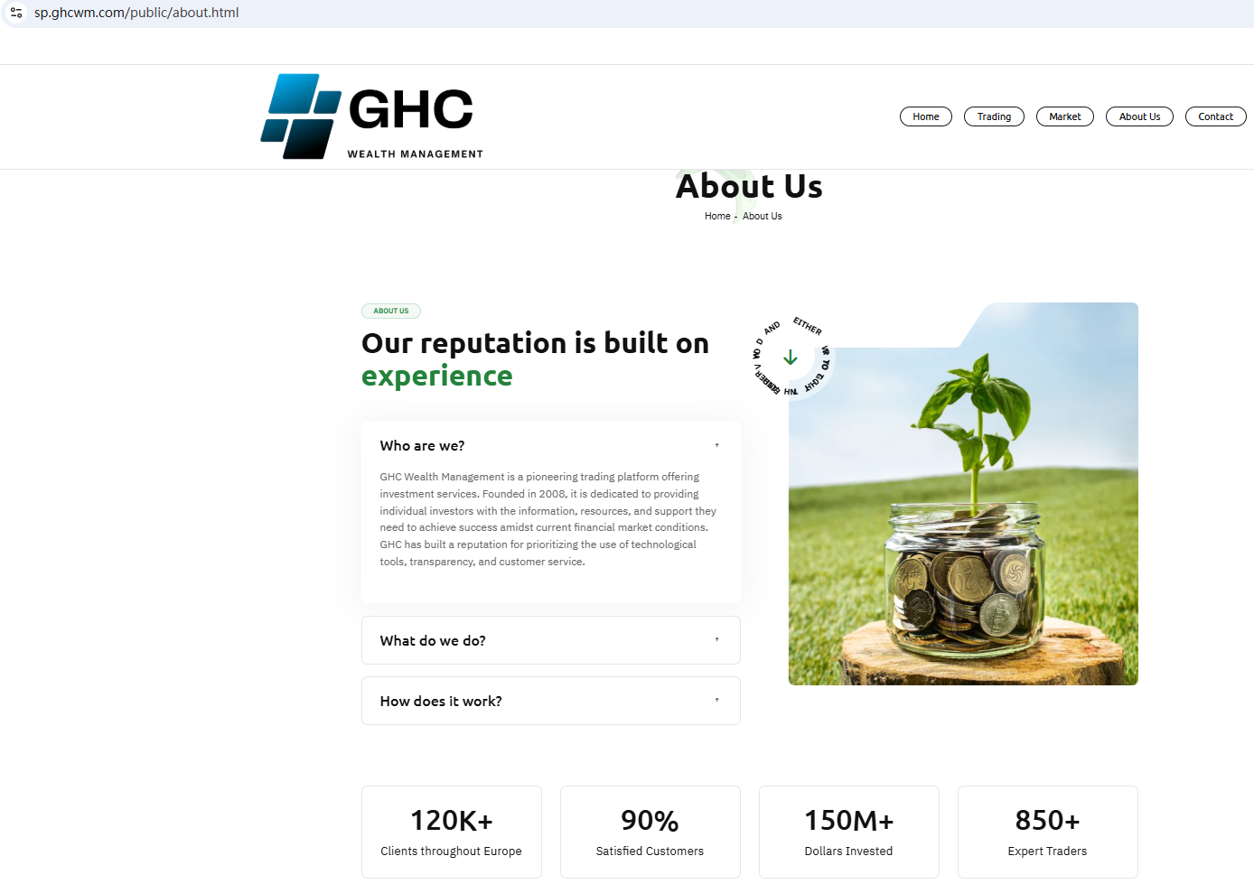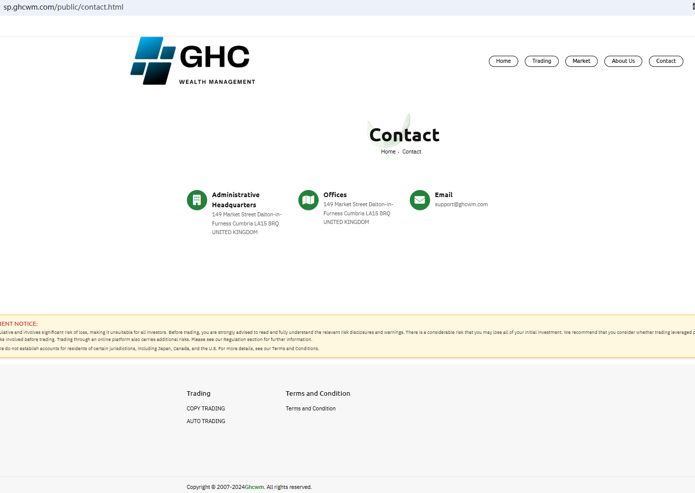 GHC Wealth Management claims to have been established in 2008 and has offices in the UK. However, upon searching, we discovered that the domain name wasn't created until 2025, and no matching information was found with the Financial Conduct Authority (FCA). Clearly, the information on the website doesn't match the facts, which in itself is a red flag. Even more noteworthy, we discovered that the National Securities Market Commission (CNMV) issued a warning against GHC Wealth Management, believing this company might be providing financial services or products without proper authorization.