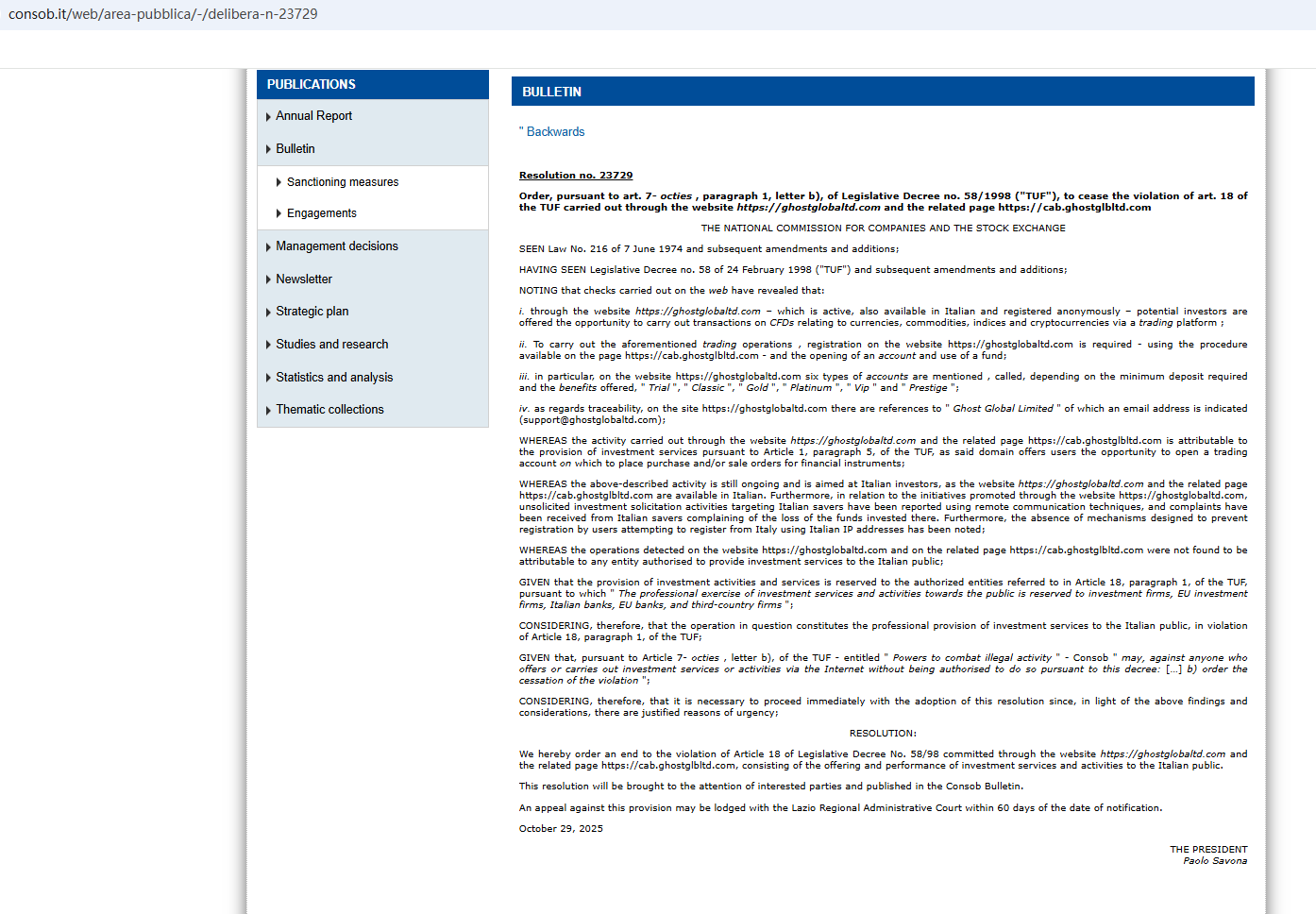 On Oct 29, 2025, the Italian Companies and Exchange Commission (CONSOB) ordered Ghost Global Limited to be blacked out since it offers financial services illegally in Italy. https://www.consob.it/web/area-pubblica/-/delibera-n-23729