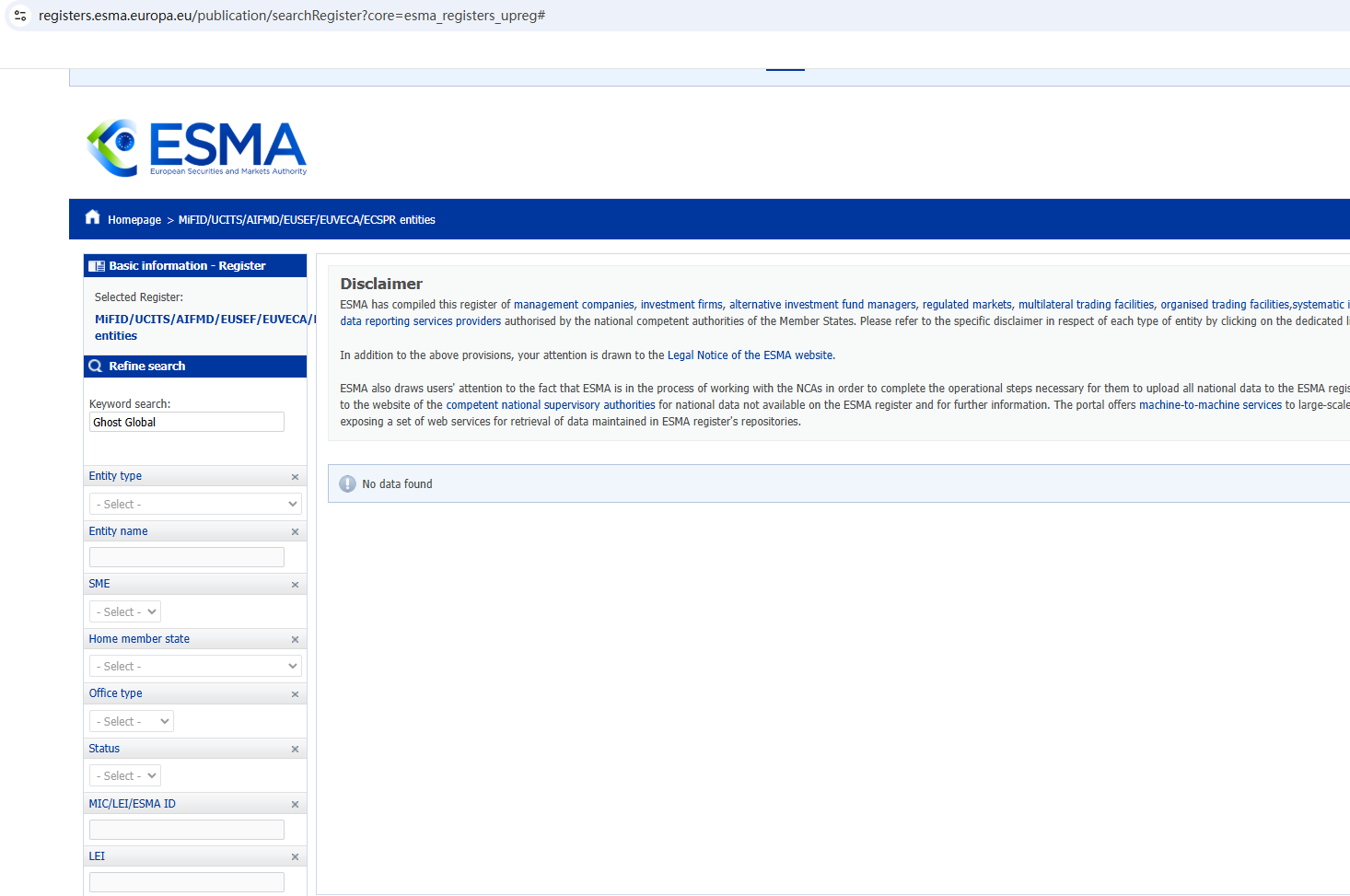 According to its website, it claims to be regulated by the European Financial Supervisory Authority (EFSA), but a search revealed no matching information on the European Securities and Markets Authority (ESMA). In addition, the Italian Companies and Exchange Commission (CONSOB) ordered Ghost Global Limited to be blacked out since it offers financial services illegally in Italy.