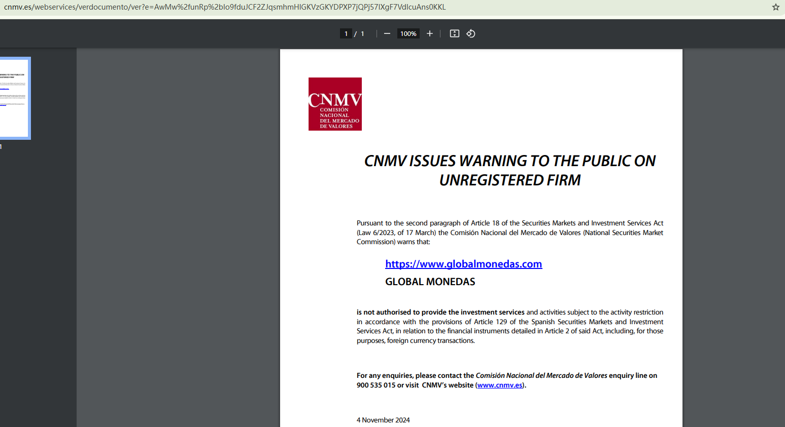 On November 4, 2024, the Comisión Nacional del Mercado de Valores (CNMV) has added GLOBAL MONEDAS to its warning list for providing investment services without authorization. https://www.cnmv.es/portal/ResultadoBusqueda.aspx?tipo=1&nombre=GLOBALMONEDAS