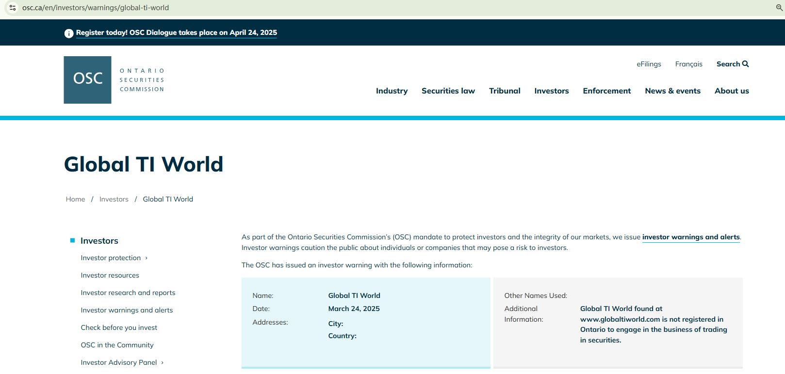 On March 24, 2025, the Ontario Securities Commission (OSC) issued a warning against Global TI World, stating that this broker is not registered in Ontario to engage in the business of trading in securities. https://www.osc.ca/en/investors/warnings/global-ti-world