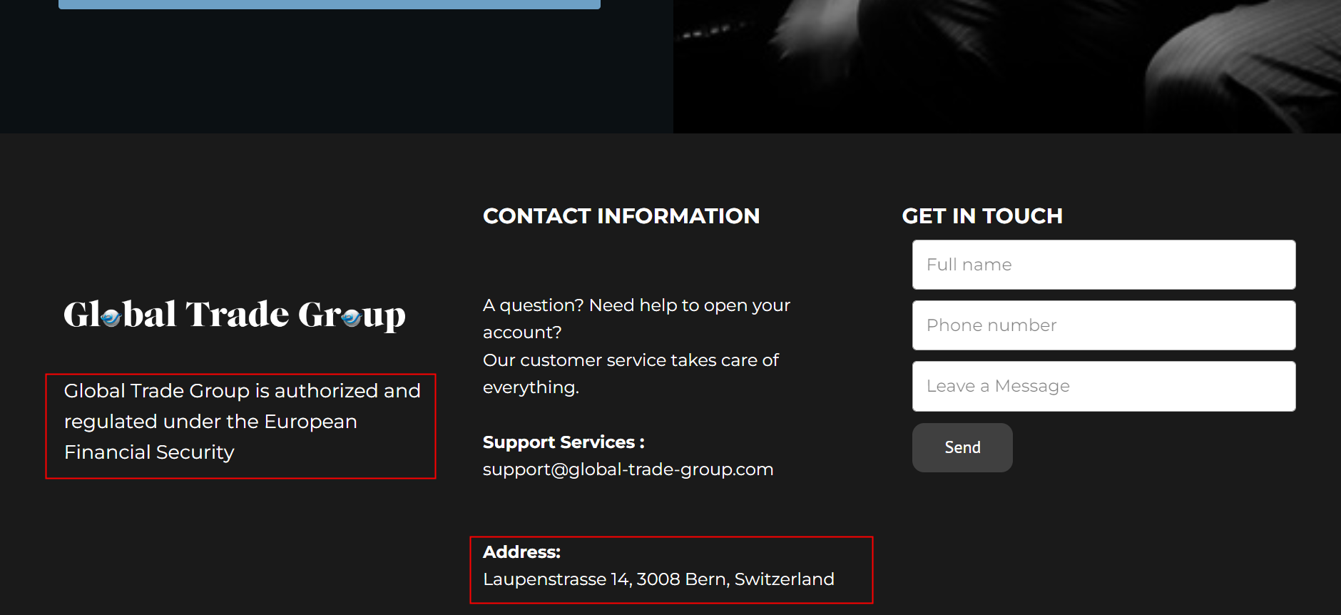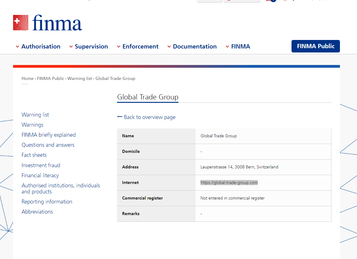In addition, Global Trade Group is located in Switzerland, upon investigation, we found that the Swiss Financial Market Suprevisory Authority (FINMA) is issued a warning that Global Trade Group was providing finacial services or products without authorisation.