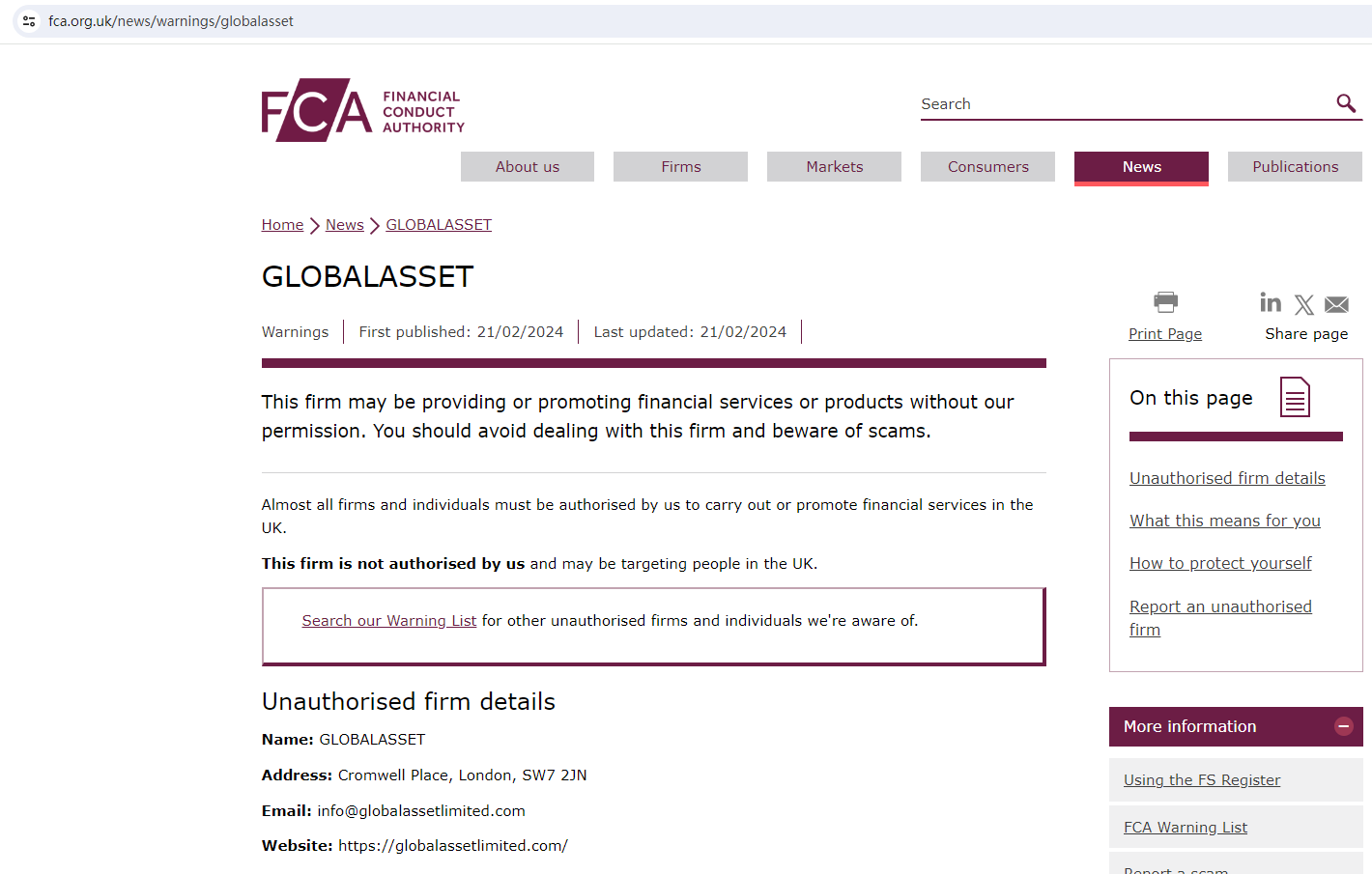 On 21 February 2024, the United Kingdom Financial Conduct Authority (UK FCA) issued a warning that GLOBALASSET was providing financial services or products in the UK without authorisation. You may visit: https://www.fca.org.uk/news/warnings/globalasset