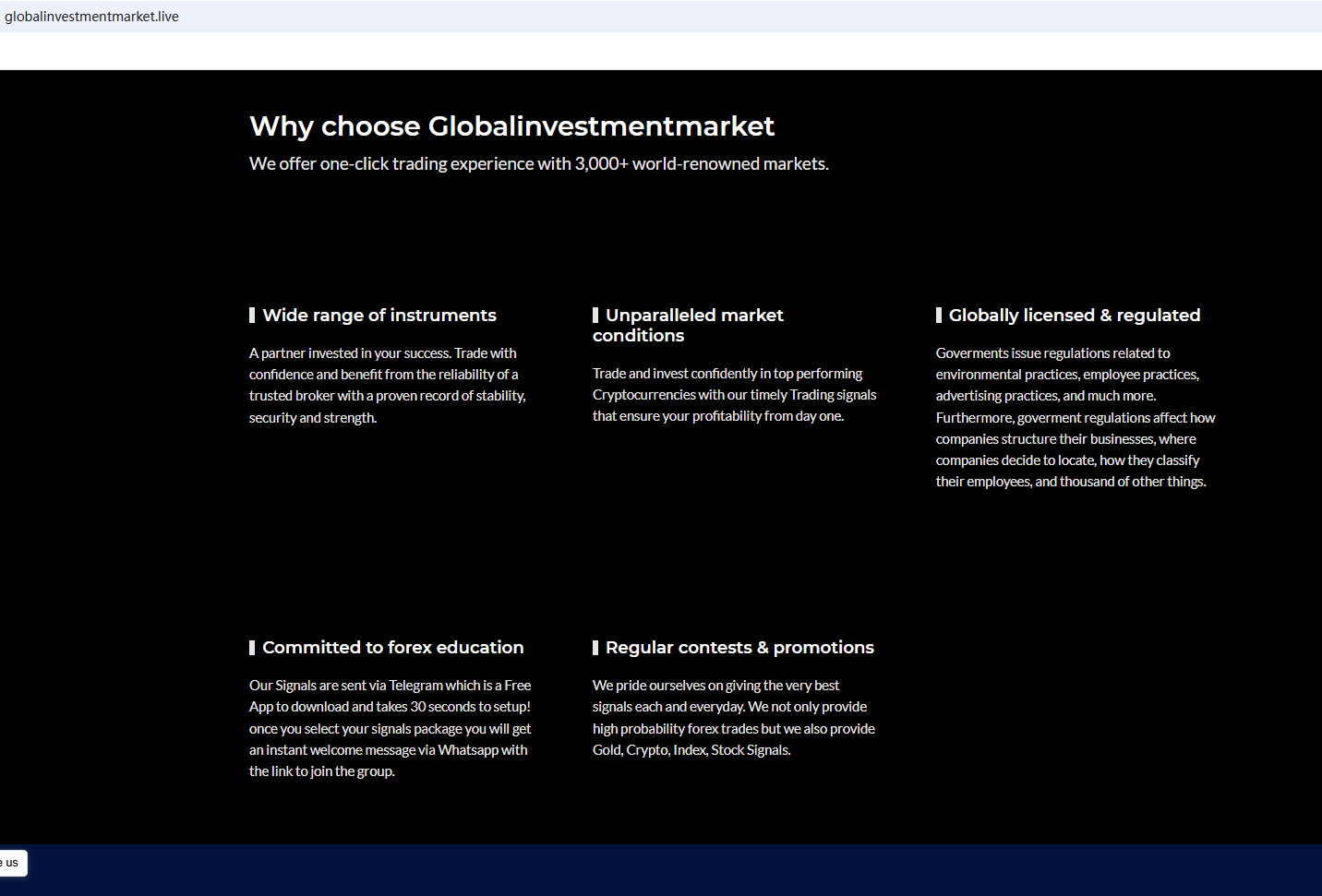 In essence, Globalinvestmentmarket is not regulated by any governing body. Entrusting it with investors' funds is highly risky, as there are no legal protections in place to safeguard the funds. Globalinvestmentmarket appears to be a scam.