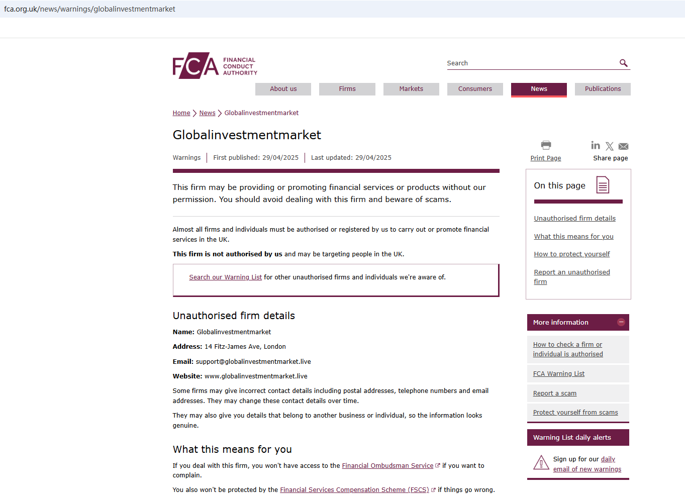 On April 29, 2025, the Financial Conduct Authority (FCA) issued a warning against Globalinvestmentmarket, believing this company might be providing financial services or products without proper authorization in the UK. https://www.fca.org.uk/news/warnings/globalinvestmentmarket
