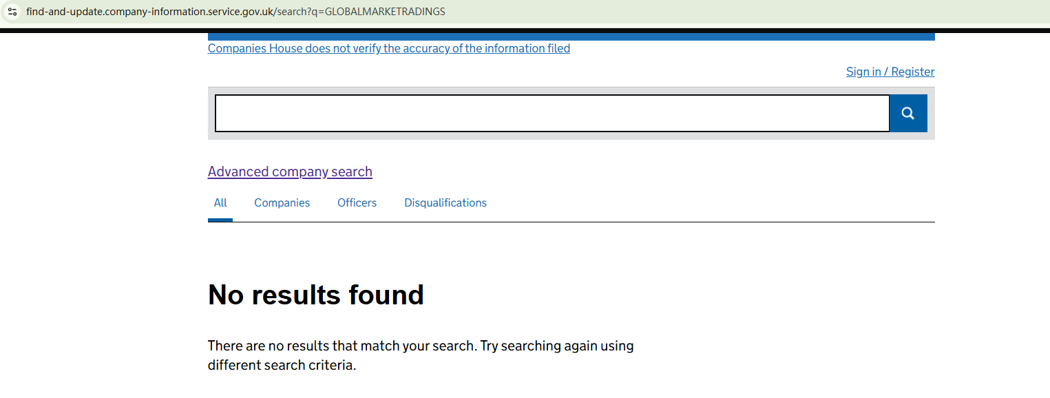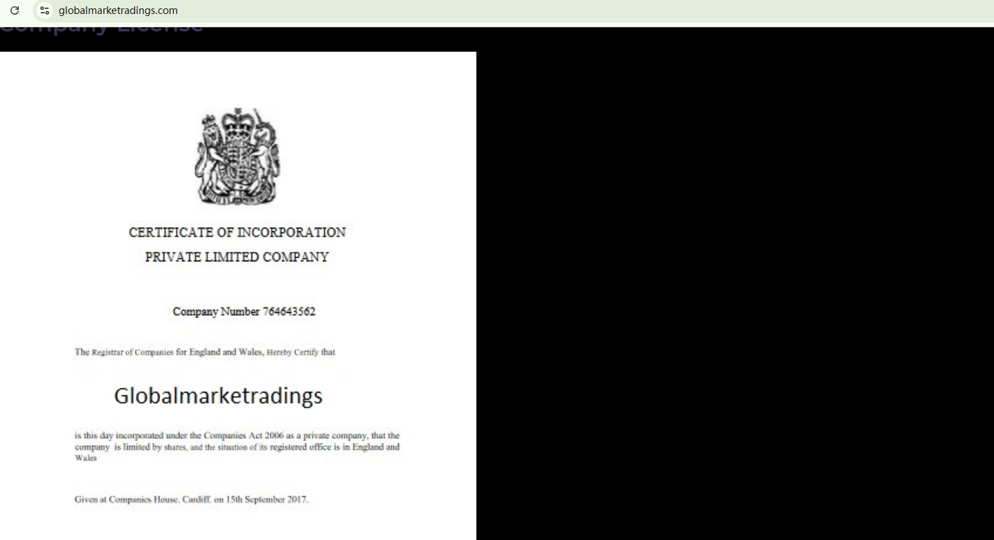 GLOBALMARKETRADINGS solely relies on an alleged certificate from the Companies House (CH) to support its authenticity. However, our research suggests that the certificate is fabricated. The company is not registered with the CH. In addition, the Financial Conduct Authority (FCA) has issued a warning about GLOBALMARKETRADINGS, noting that the firm is operating in the UK without the required authorization.
