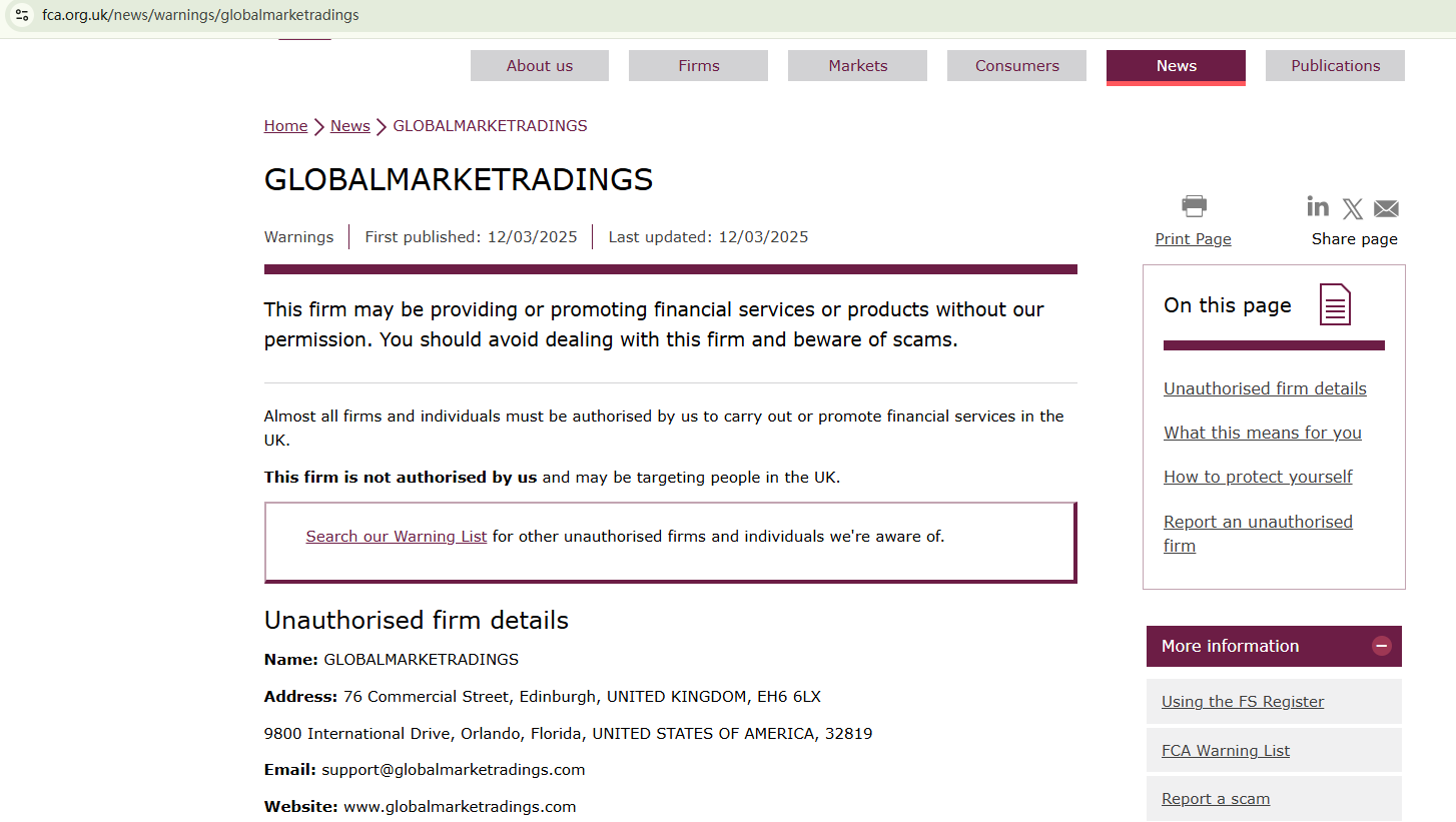 On March 12, 2025, the Financial Conduct Authority (FCA) issued a warning against GLOBALMARKETRADINGS, believing this company might be providing financial services or products without proper authorization in the UK. https://www.fca.org.uk/news/warnings/globalmarketradings