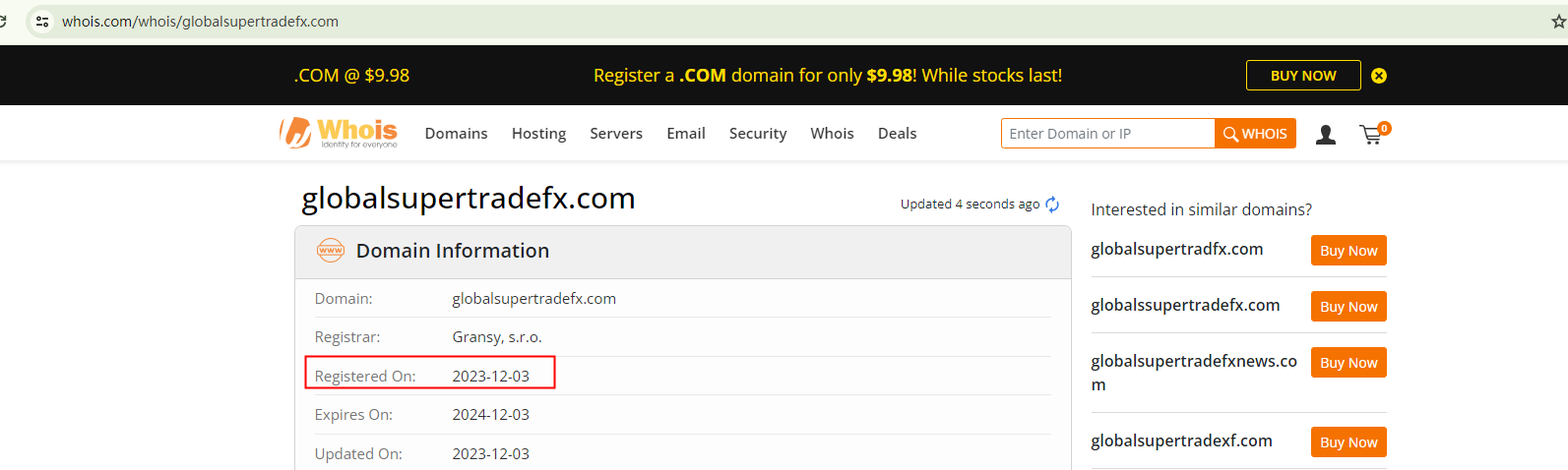 Despite its claims of a global presence, Globalsupertradefx fails to provide any details about the necessary licenses it should possess. This absence of information is a significant red flag for potential scams. In contradiction to its claims, the domain globalsupertradefx.com was only registered recently, in December 2023. It raises questions about how such a nascent website could have achieved the reputation and accomplishments it purports to have.