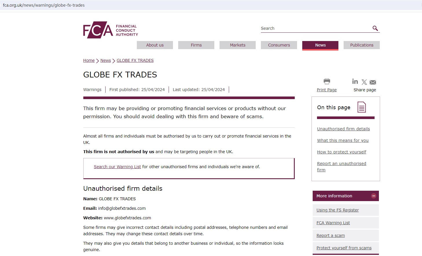 On April 25, 2024, the UK Financial Conduct Authority (FCA) issued a warning to GLOBE FX TRADES, stating that it may be offering financial services or products in the UK without authorization. For more information, please visit https://www.fca.org.uk/news/warnings/globe-fx-trades .
