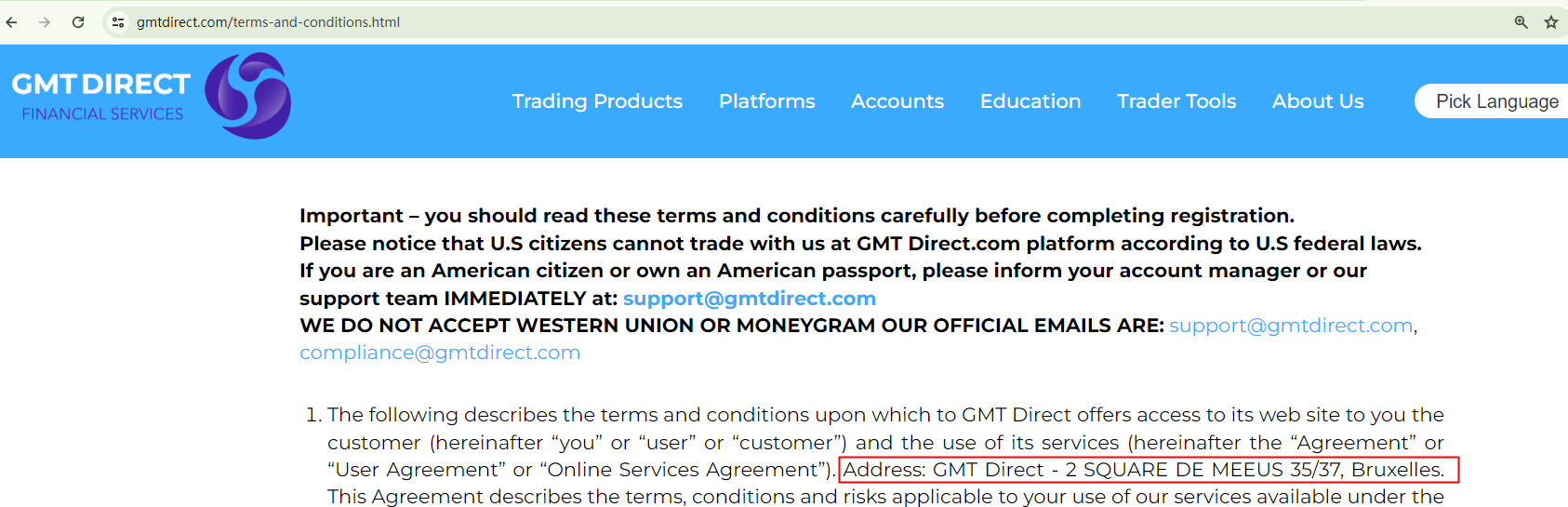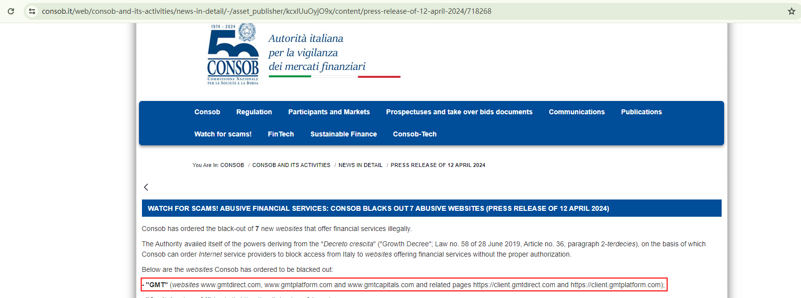 On April 12, 2024, the Italian Companies and Exchange Commission (CONSOB) ordered three websites of GMT to be blacked out since they offer financial services illegally in Italy, they are: gmtdirect.com, gmtplatform.com and gmtcapitals.com. https://www.consob.it/web/consob-and-its-activities/news-in-detail/-/asset_publisher/kcxlUuOyjO9x/content/press-release-of-12-april-2024/718268