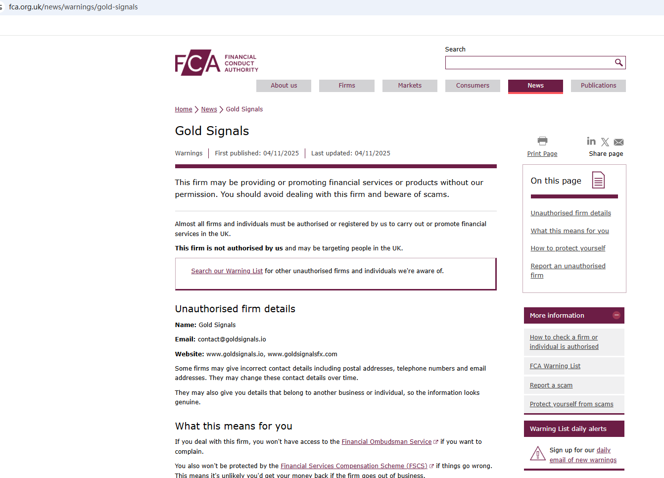 On Nov 4, 2025, the Financial Conduct Authority (FCA) issued a warning regarding Gold Signals, suspecting that this company may be offering financial services or products without the necessary authorization. https://www.fca.org.uk/news/warnings/gold-signals