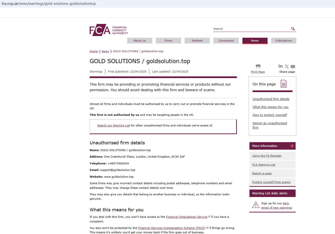 On April 22, 2025, the Financial Conduct Authority (FCA) issued a warning against Gold solutions, believing this company might be providing financial services or products without proper authorization in the UK. https://www.fca.org.uk/news/warnings/gold-solutions-goldsolutiontop