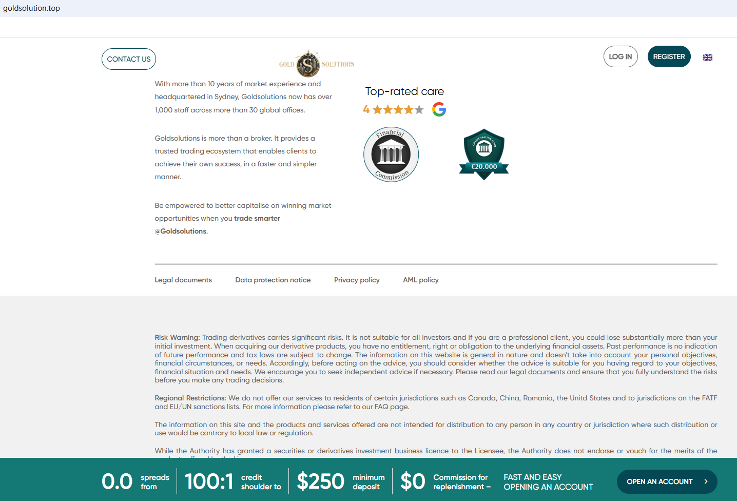 BrokersView found that the domain "goldsolution.top" is currently inaccessible. This is widely regarded as a significant red flag, as the suspension of a broker's website often points to underlying regulatory or operational issues.