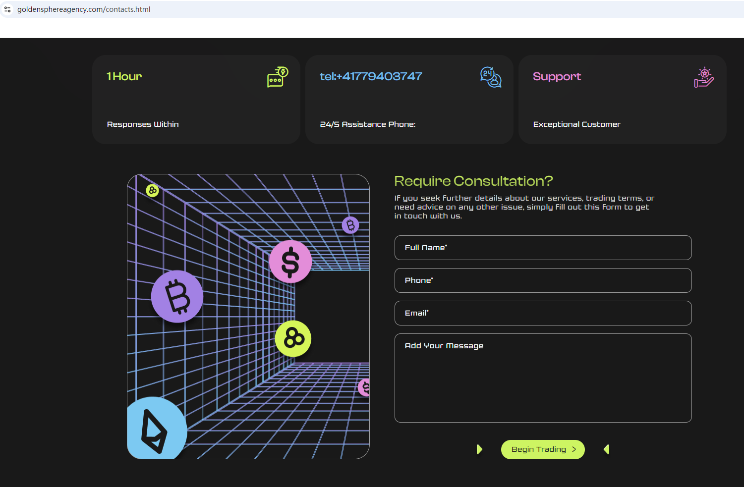 BrokersView found that the domain "https://goldensphereagency.com/" is currently inaccessible. This is widely regarded as a significant red flag, as the suspension of a broker's website often points to underlying regulatory or operational issues.