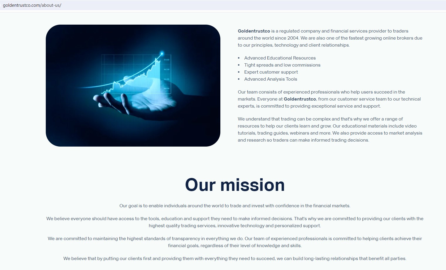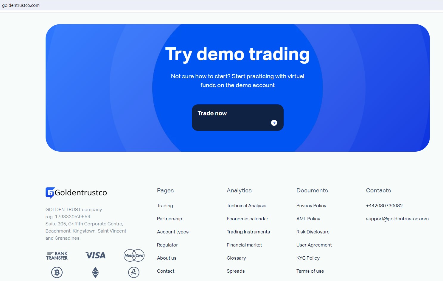 Goldentrustco (GOLDEN TRUST) claims to be a regulated company and financial services provider located in the Saint Vincent and Grenadines, offering wide range of financial services, including Shares, Cryptocurrencies, Indices, Forex, Metals and more instruments in global markets. But there is no detailed financial services licenses and other licensing certificates. A company that offers financial services must have financial license in the country where it is located.
