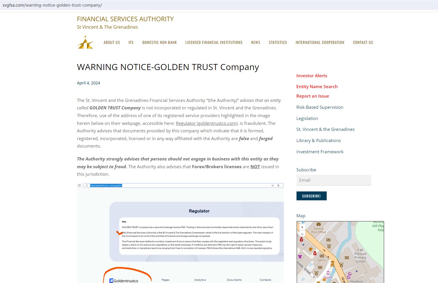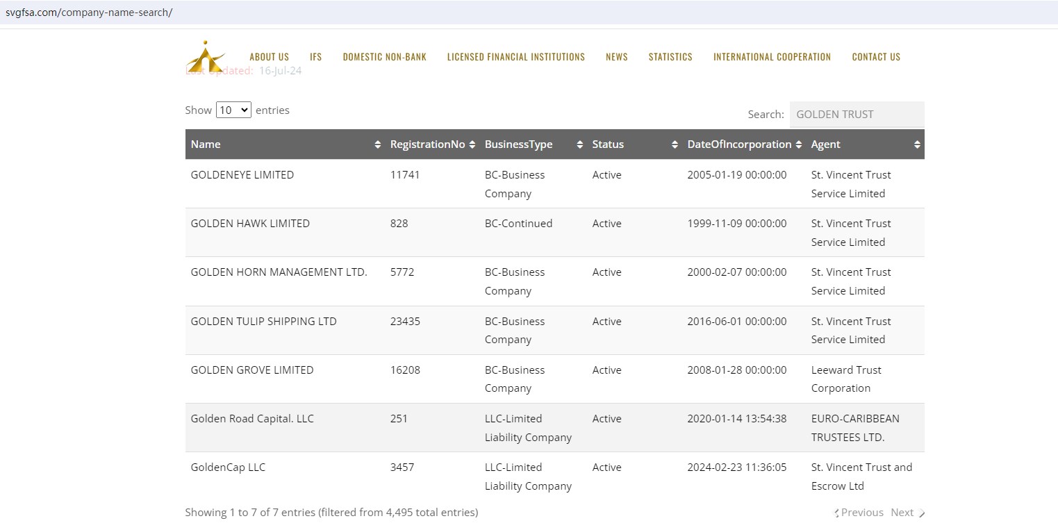 the SVG FSA issued a Warning Notice against GOLDEN TRUST (goldentrustco.com), stating that GOLDEN TRUST Company is not incorporated or regulated in St. Vincent and the Grenadines.