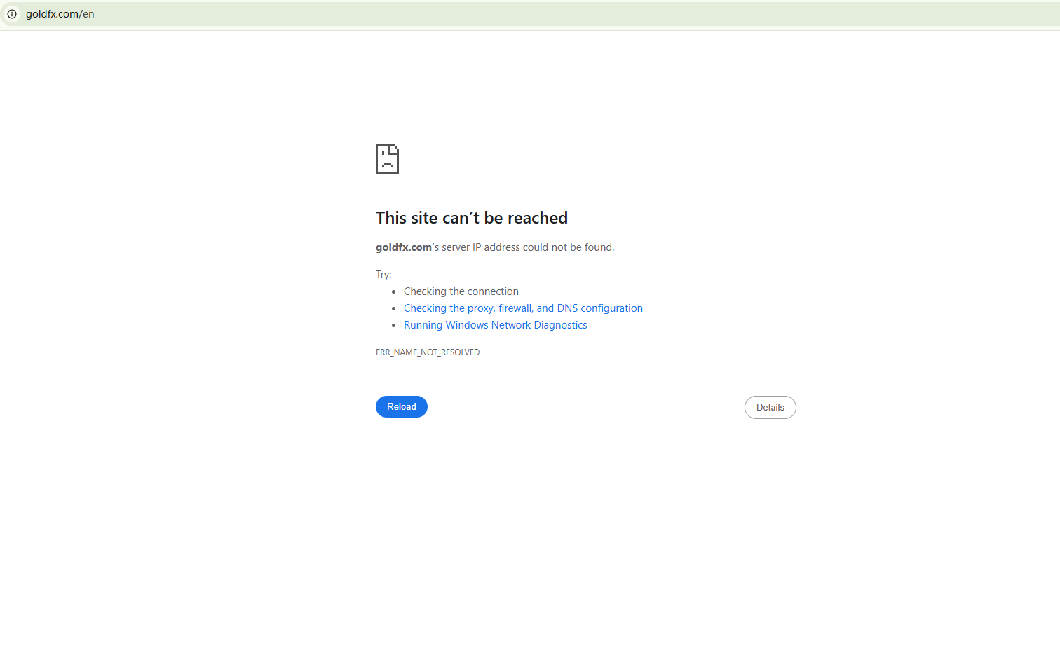We found that the domain "https://goldfx.com/en" is currently inaccessible. This is widely regarded as a significant red flag, as the suspension of a broker's website often points to underlying regulatory or operational issues.