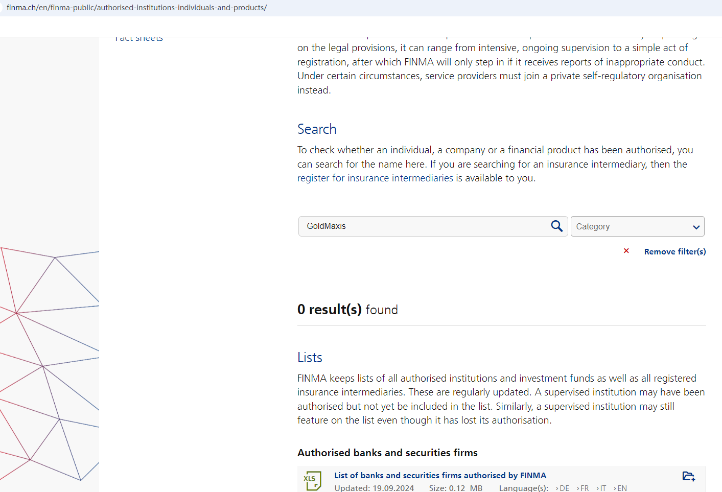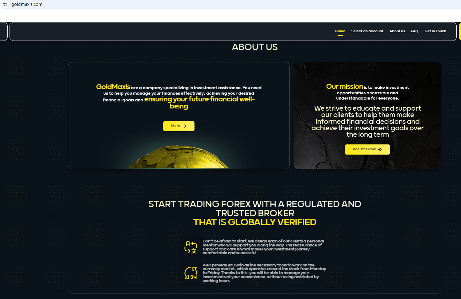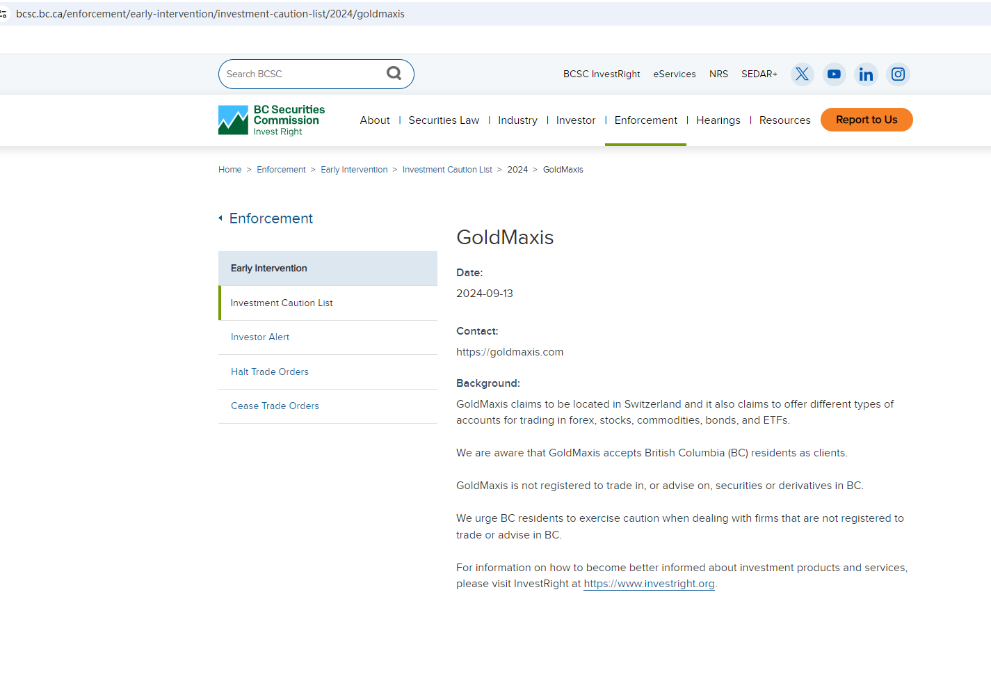 On September 13, 2024, the British Columbia Securities Commission (BCSC) issued a warning against GoldMaxis, identifying it as an unauthorized firm. https://www.bcsc.bc.ca/enforcement/early-intervention/investment-caution-list/2024/goldmaxis