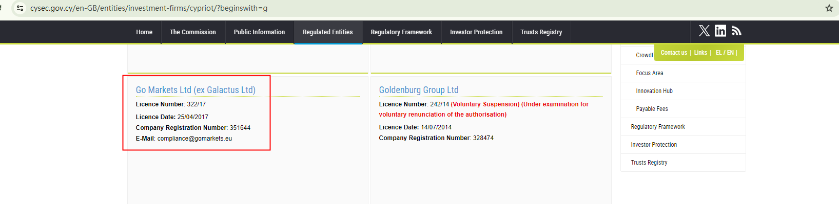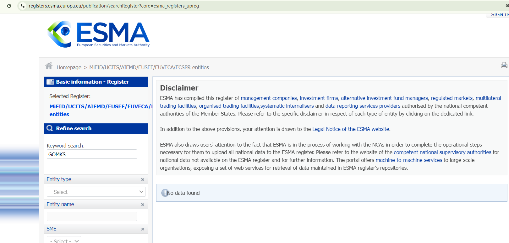 GOMKS purports to be regulated by the Cyprus Securities and Exchange Commission (CySEC), the Comisión Nacional del Mercado de Valores (CNMV), and the Italian Companies and Exchange Commission (CONSOB). This claim prompted us to search the register of the European Securities and Markets Authority (ESMA), a resource that provides access to relevant registers and statistical data for market participants, regulators, and the general public. However, our search yielded no matching records for GOMKS. While there is a "Go Markets Ltd" listed in the CySEC register, it is evident from the disclosed information of the license holder that GOMKS is not associated with this licensed entity.