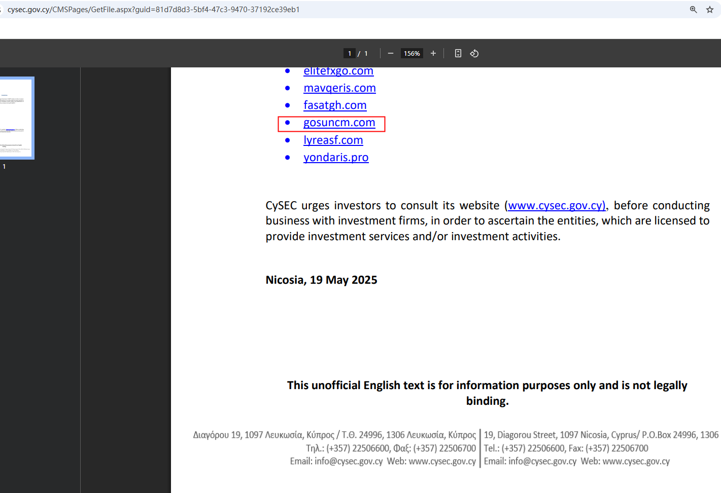 On May 19, 2025, the Cyprus Securities and Exchange Commission (CySEC) issued a warning against Gosuncm, believing this company might be providing financial services or products without authorisation. You may visit: https://www.cysec.gov.cy/CMSPages/GetFile.aspx?guid=81d7d8d3-5bf4-47c3-9470-37192ce39eb1
